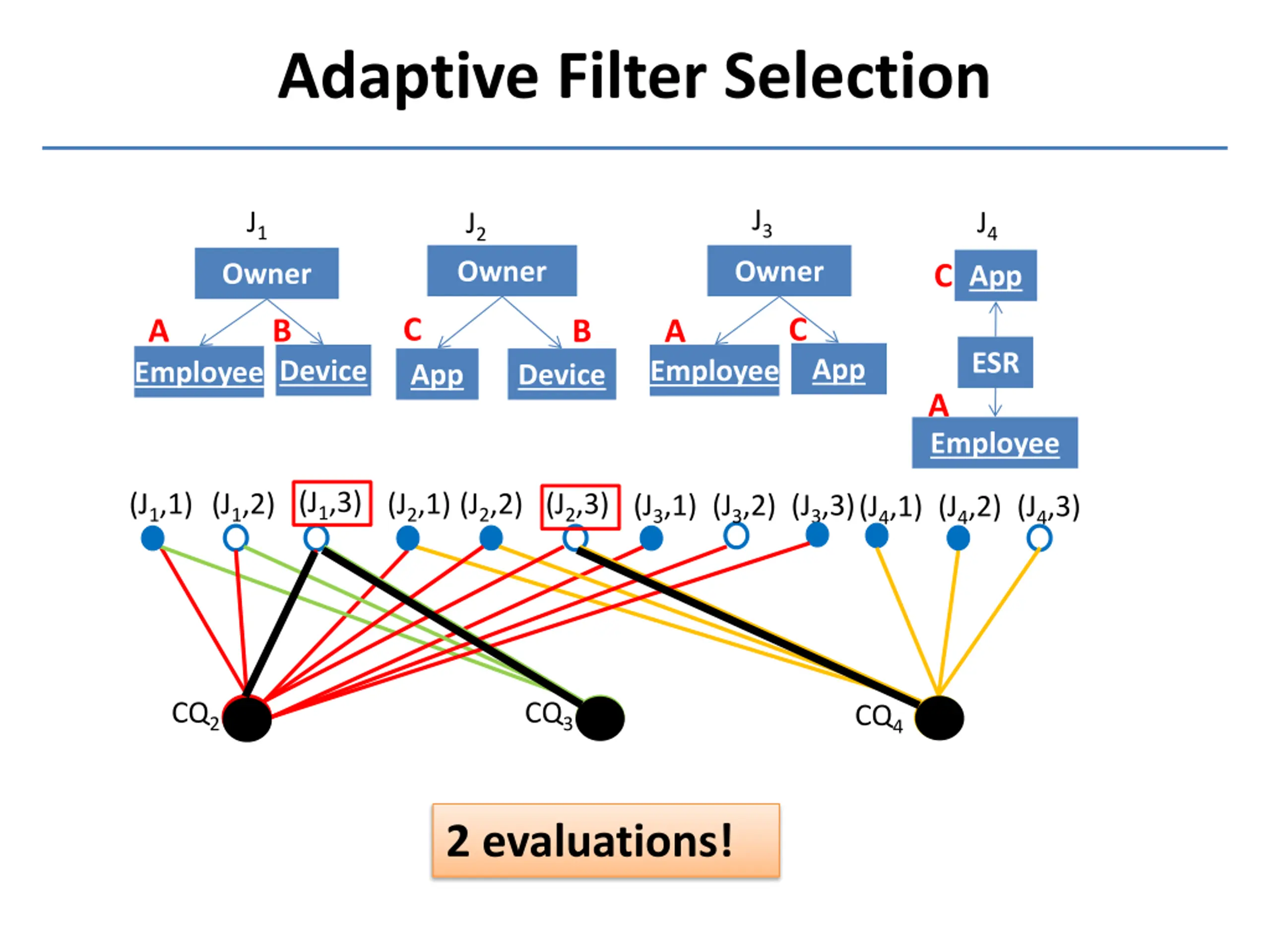 Adaptive Filter Selection J3 J1 J4 J2 Owner Owner Owner C App C C B A B A ESR App Employee Device Employee App Device A Employee (J1,1) (J1,2) (J1,3) (J2,1) (J2,2) (J2,3) (J3,1) (J3,2) (J3,3)(J4,1) (J4,2) (J4,3) CQ2 CQ3 CQ4 5 evaluations!