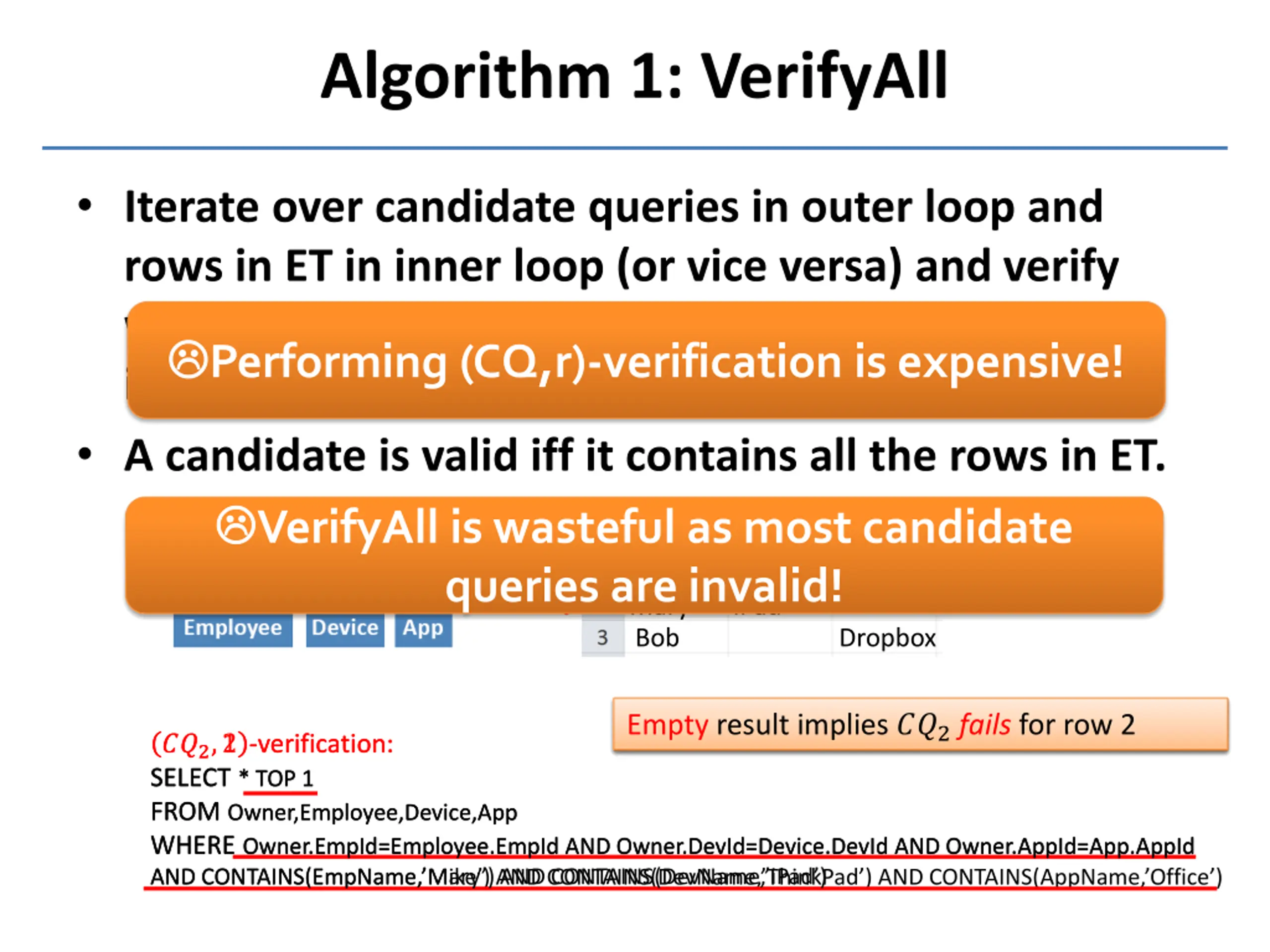Algorithm 1: VerifyAll Iterate over candidate queries in outer loop and rows in ET in inner loop (or vice versa) and verify whether a candidate query ?? contains a row ? in its output. A candidate is valid iff it contains all the rows in ET. VerifyAll is wasteful as most candidate queries are invalid! Performing (CQ,r)-verification is expensive! ThinkPad Office Mike Mary Bob iPad Dropbox Non-empty result implies ??2satisfies row 1 Empty result implies ??2fails for row 2 ??2,2 -verification: SELECT * TOP 1 FROM Owner,Employee,Device,App WHERE Owner.EmpId=Employee.EmpId AND Owner.DevId=Device.DevId AND Owner.AppId=App.AppId ??2,1 -verification: SELECT * TOP 1 FROM Owner,Employee,Device,App WHERE Owner.EmpId=Employee.EmpId AND Owner.DevId=Device.DevId AND Owner.AppId=App.AppId AND CONTAINS(EmpName, Mike ) AND CONTAINS(DevName, ThinkPad ) AND CONTAINS(AppName, Office ) AND CONTAINS(EmpName, Mary ) AND CONTAINS(DevName, iPad )