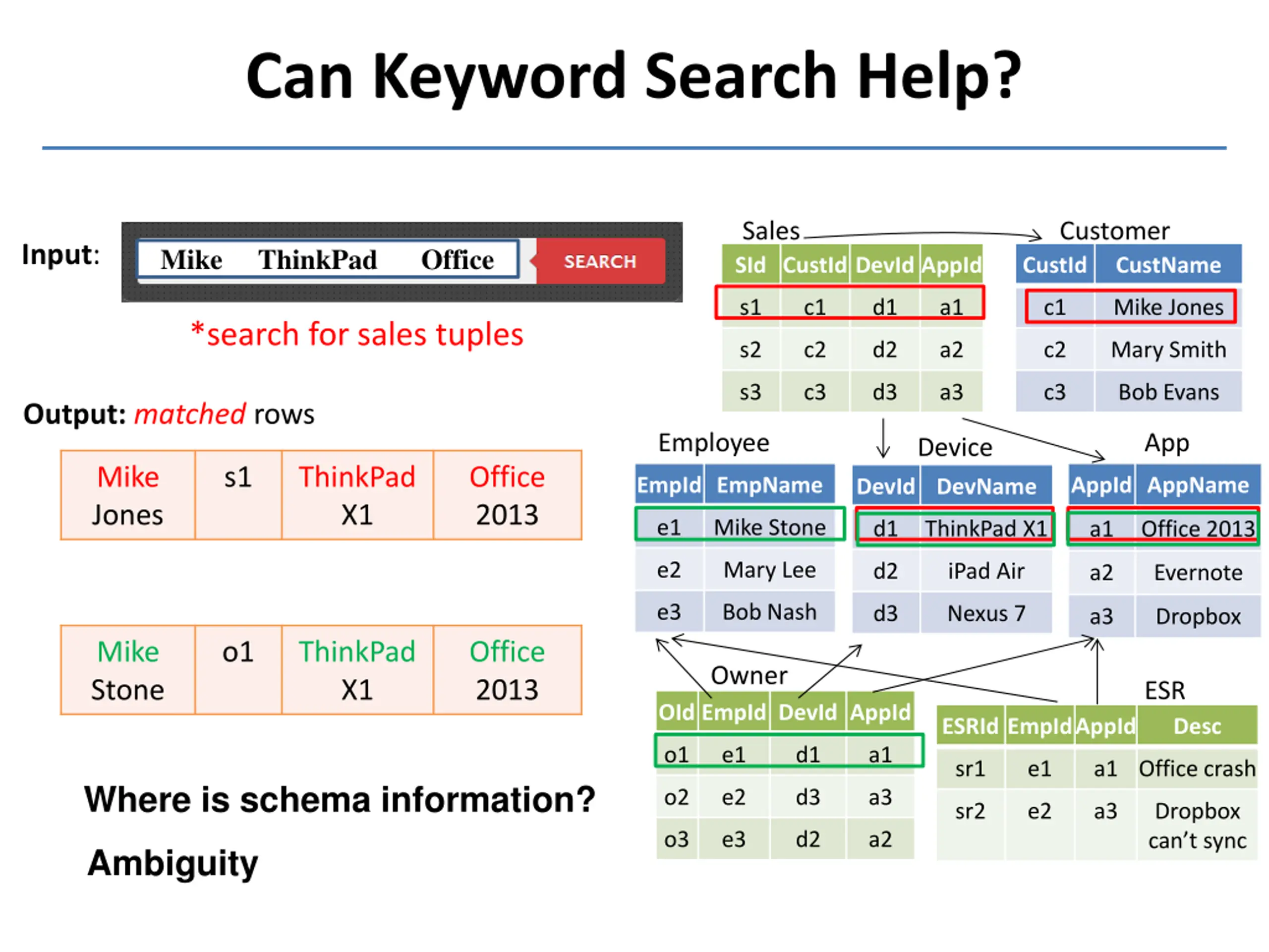 Can Keyword Search Help? Sales Customer Input: Mike ThinkPad Office SId CustId DevId AppId CustId CustName s1 c1 d1 a1 c1 Mike Jones *search for sales tuples s2 c2 d2 a2 c2 Mary Smith s3 c3 d3 a3 c3 Bob Evans Output:matched rows App Employee Device Mike Jones s1 ThinkPad X1 Office 2013 EmpId EmpName AppId AppName DevId DevName e1 Mike Stone d1 ThinkPad X1 a1 Office 2013 e2 Mary Lee d2 iPad Air a2 Evernote e3 Bob Nash d3 Nexus 7 a3 Dropbox Mike Stone o1 ThinkPad X1 Office 2013 Owner ESR OId EmpId DevId AppId ESRId EmpIdAppId Desc o1 e1 d1 a1 sr1 e1 a1 Office crash Where is schema information? o2 e2 d3 a3 sr2 e2 a3 Dropbox can t sync o3 e3 d2 a2 Ambiguity