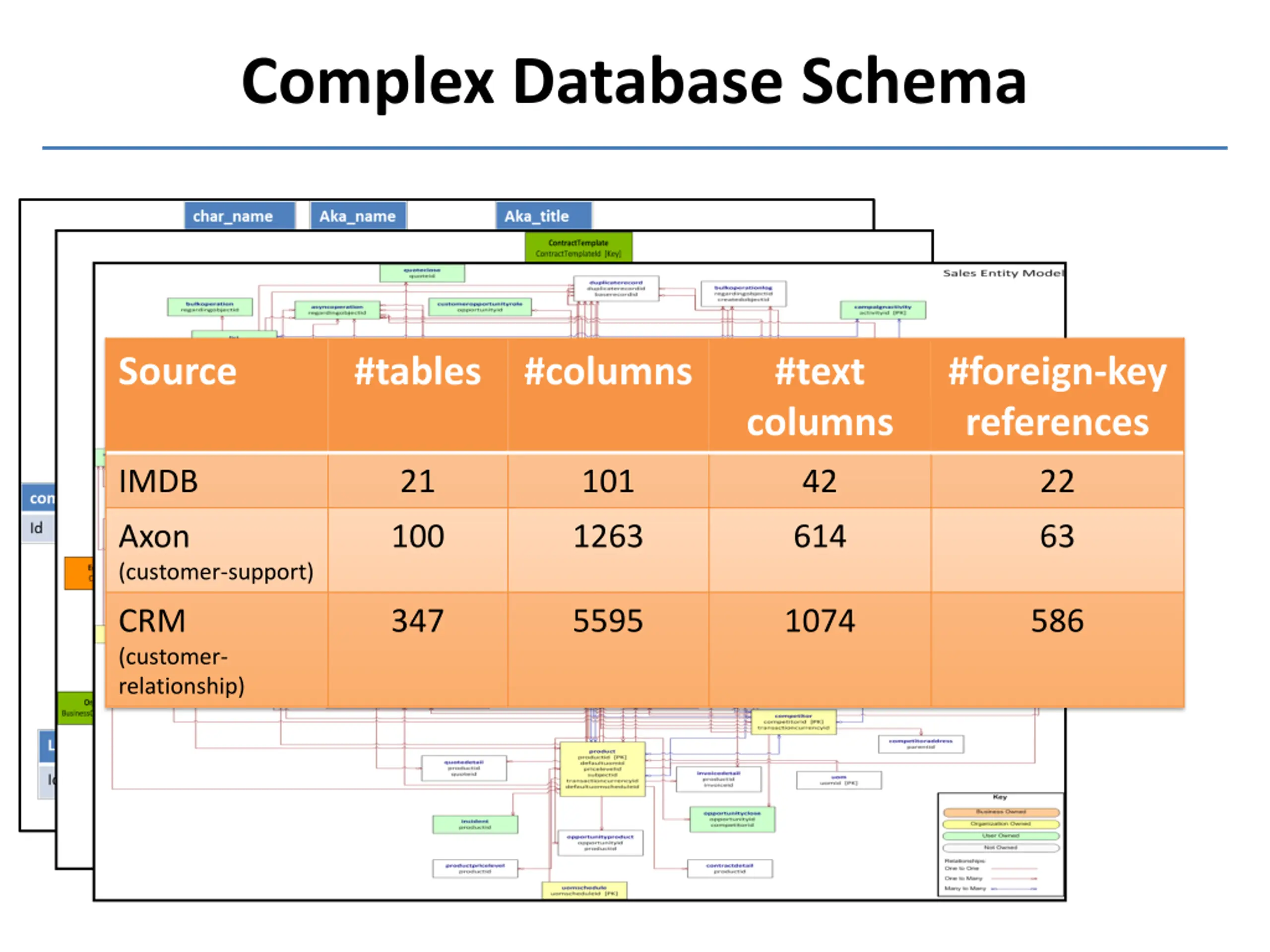 Complex Database Schema Source #tables #columns #text columns #foreign-key references IMDB 21 101 42 22 Axon (customer-support) 100 1263 614 63 CRM (customer- relationship) 347 5595 1074 586