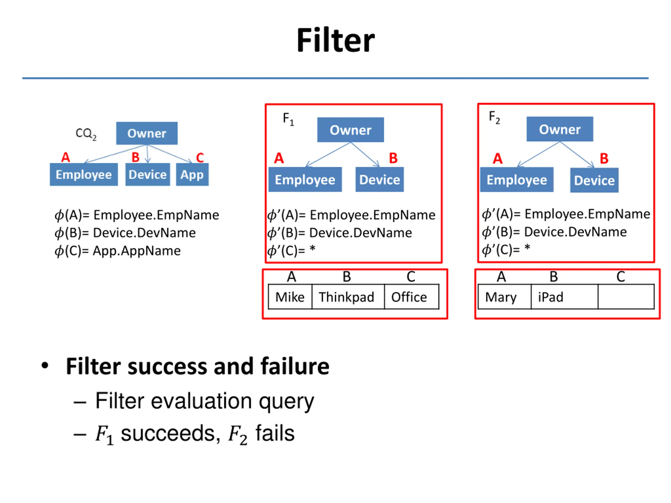 Filter F2 F1 Owner Owner A B A B Employee Device Employee Device ? (A)= Employee.EmpName ? (B)= Device.DevName ? (C)= * ?(A)= Employee.EmpName ?(B)= Device.DevName ?(C)= App.AppName ? (A)= Employee.EmpName ? (B)= Device.DevName ? (C)= * A B C A B C Mike Thinkpad Office Mary iPad Filter success and failure Filter evaluation query ?1succeeds, ?2 fails