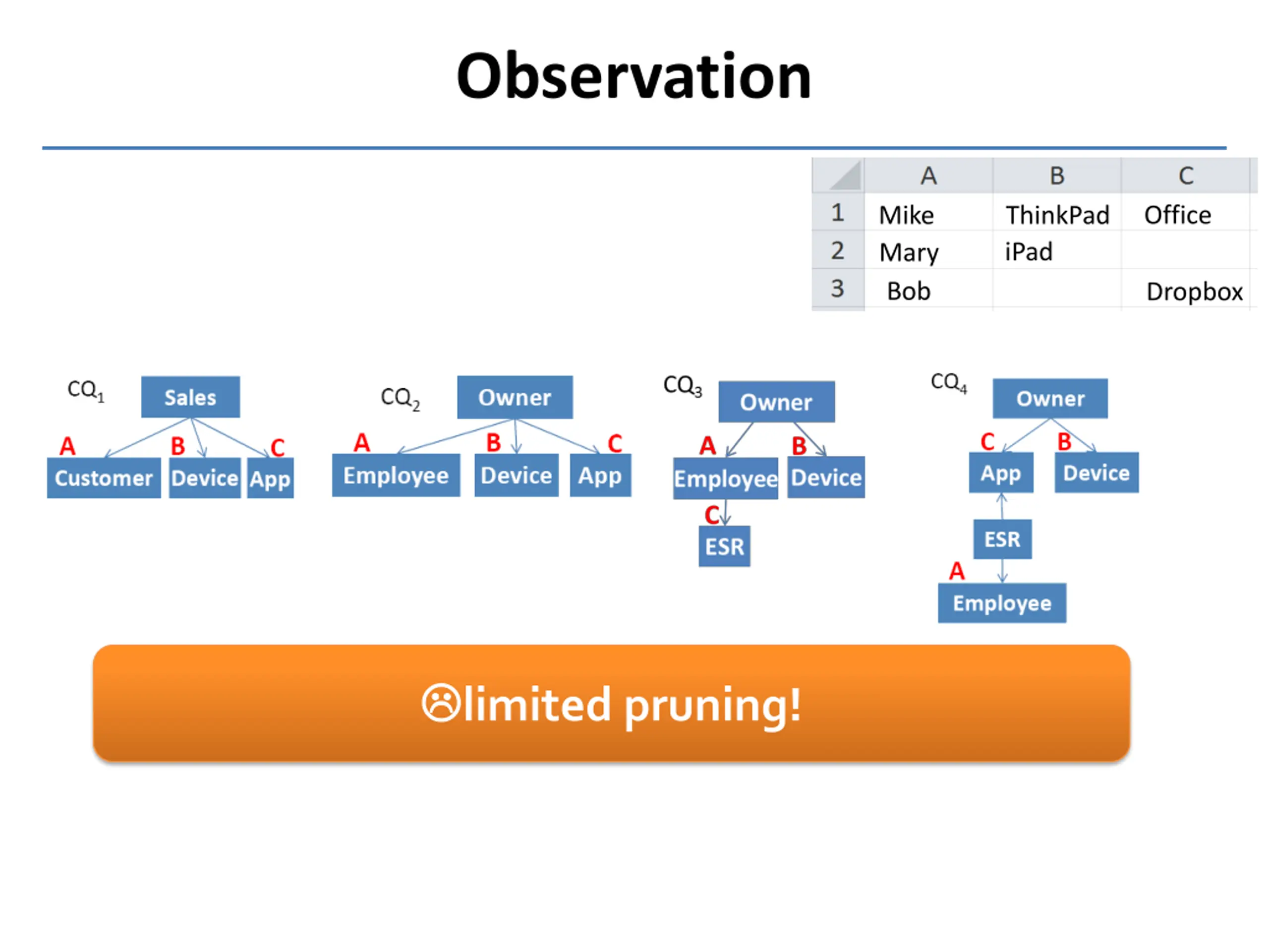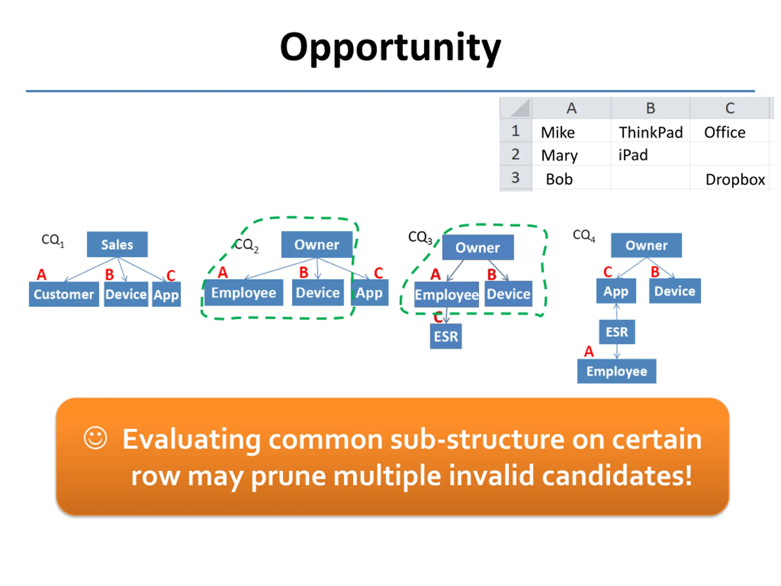 Opportunity Office Mike Mary Bob ThinkPad iPad Dropbox Evaluating common sub-structure on certain row may prune multiple invalid candidates!