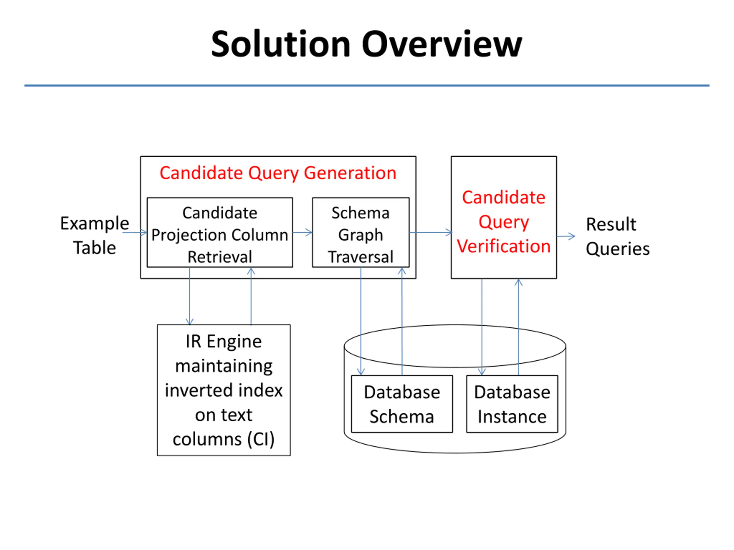 Solution Overview Candidate Query Generation Candidate Query Verification Candidate Projection Column Retrieval Schema Graph Traversal Example Table Result Queries IR Engine maintaining inverted index on text columns (CI) Database Schema Database Instance