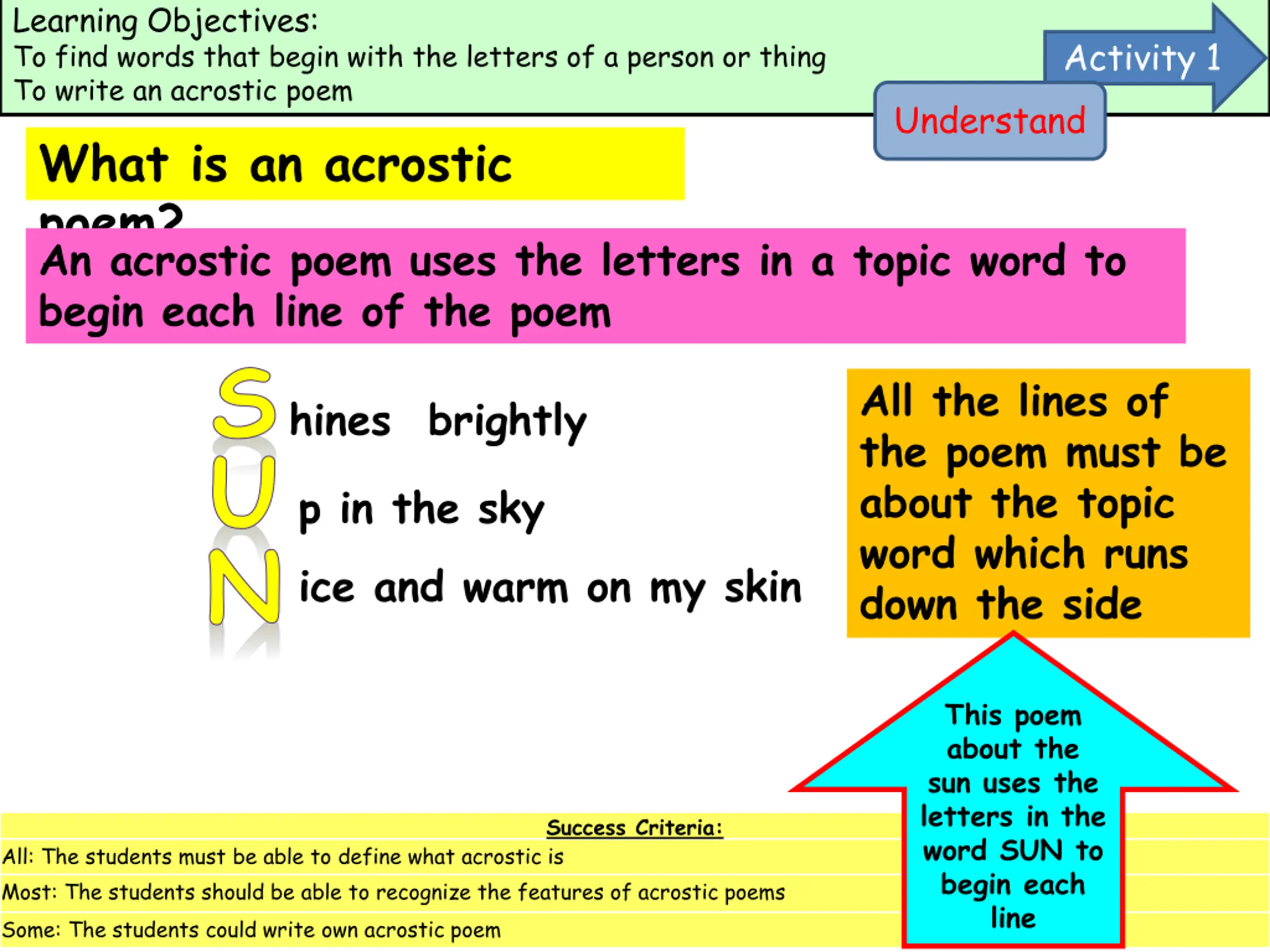 Learning Objectives: To find words that begin with the letters of a person or thing To write an acrostic poem Activity 1 Understand Success Criteria: All: The students must be able to define what acrostic is Most: The students should be able to recognize the features of acrostic poems Some: The students could write own acrostic poem