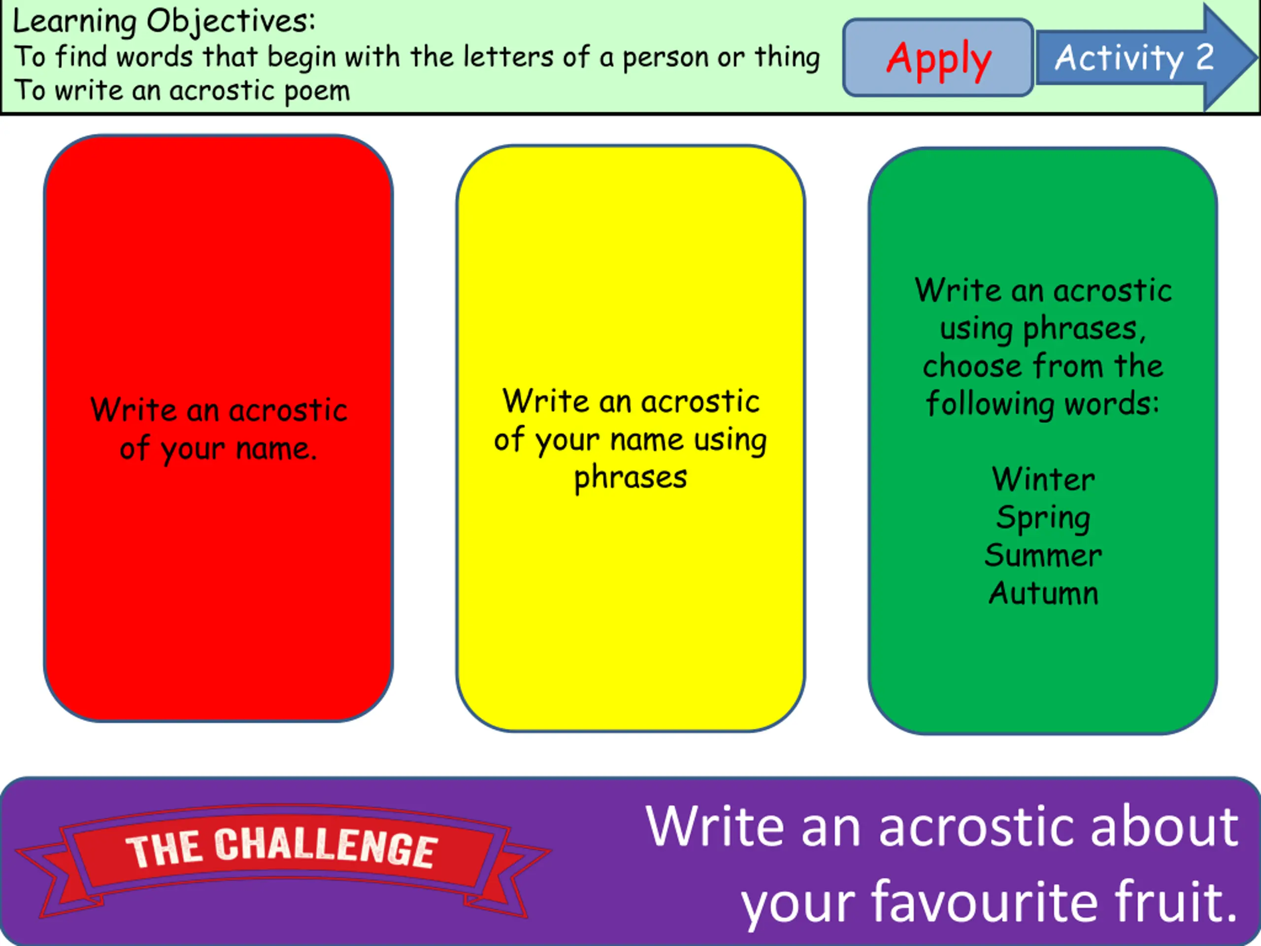 Learning Objectives: To find words that begin with the letters of a person or thing To write an acrostic poem Apply Activity 2 Write an acrostic using phrases, choose from the following words: Write an acrostic of your name using phrases Write an acrostic of your name. Winter Spring Summer Autumn Write an acrostic about your favourite fruit.