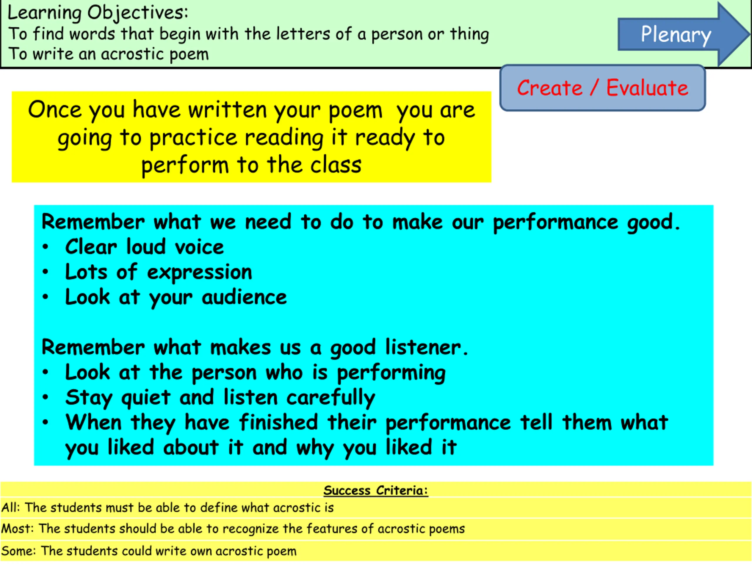 Learning Objectives: To find words that begin with the letters of a person or thing To write an acrostic poem Plenary Create / Evaluate Once you have written your poem you are going to practice reading it ready to perform to the class Remember what we need to do to make our performance good. Clear loud voice Lots of expression Look at your audience Remember what makes us a good listener. Look at the person who is performing Stay quiet and listen carefully When they have finished their performance tell them what you liked about it and why you liked it Success Criteria: All: The students must be able to define what acrostic is Most: The students should be able to recognize the features of acrostic poems Some: The students could write own acrostic poem