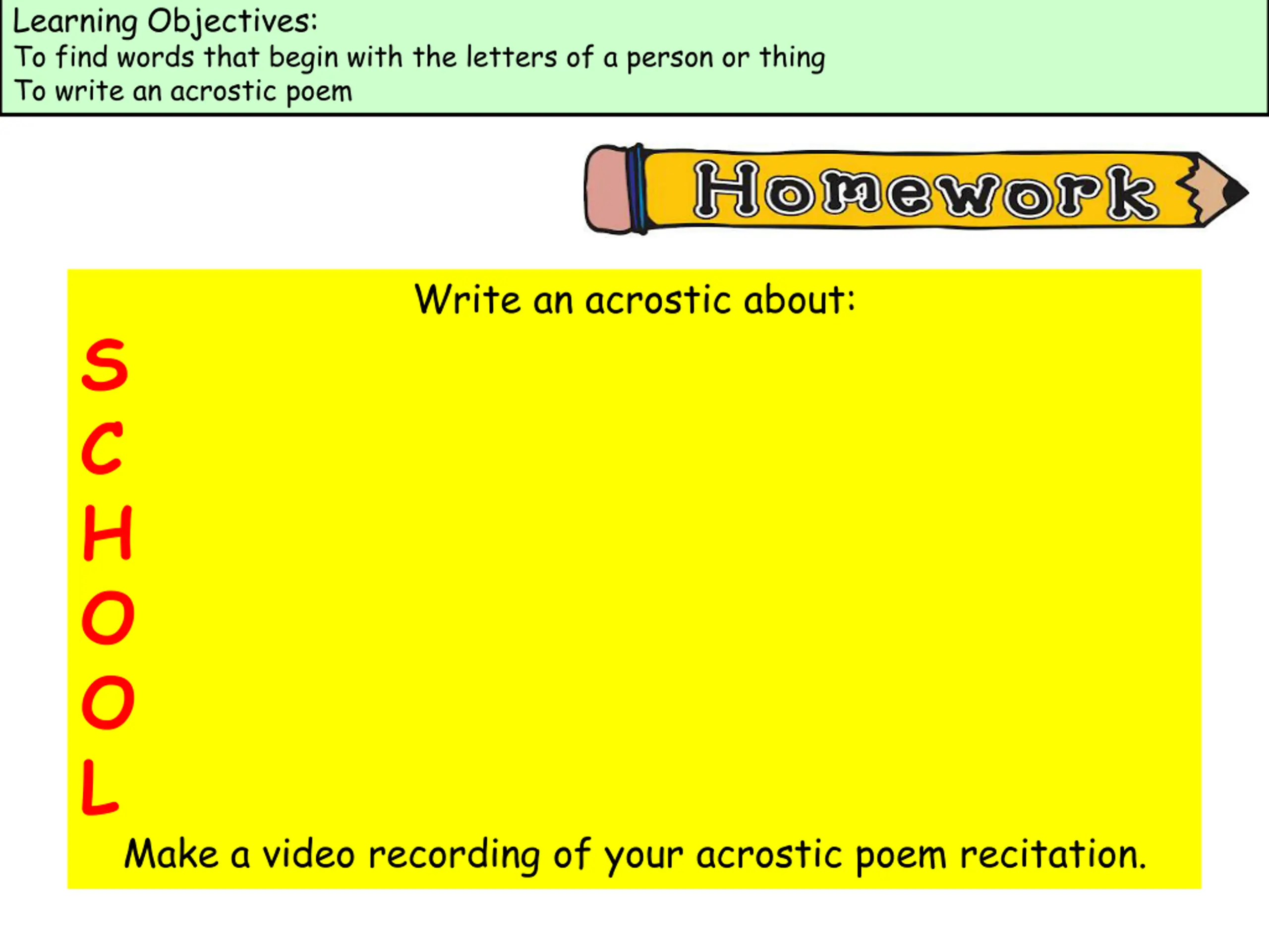 Learning Objectives: To find words that begin with the letters of a person or thing To write an acrostic poem Write an acrostic about: S C H O O L Make a video recording of your acrostic poem recitation.