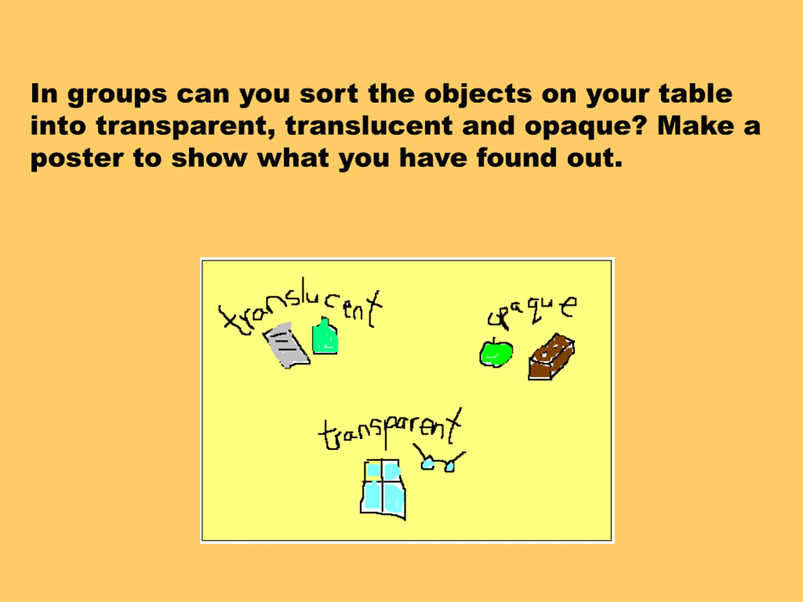 In groups can you sort the objects on your table into transparent, translucent and opaque? Make a poster to show what you have found out.
