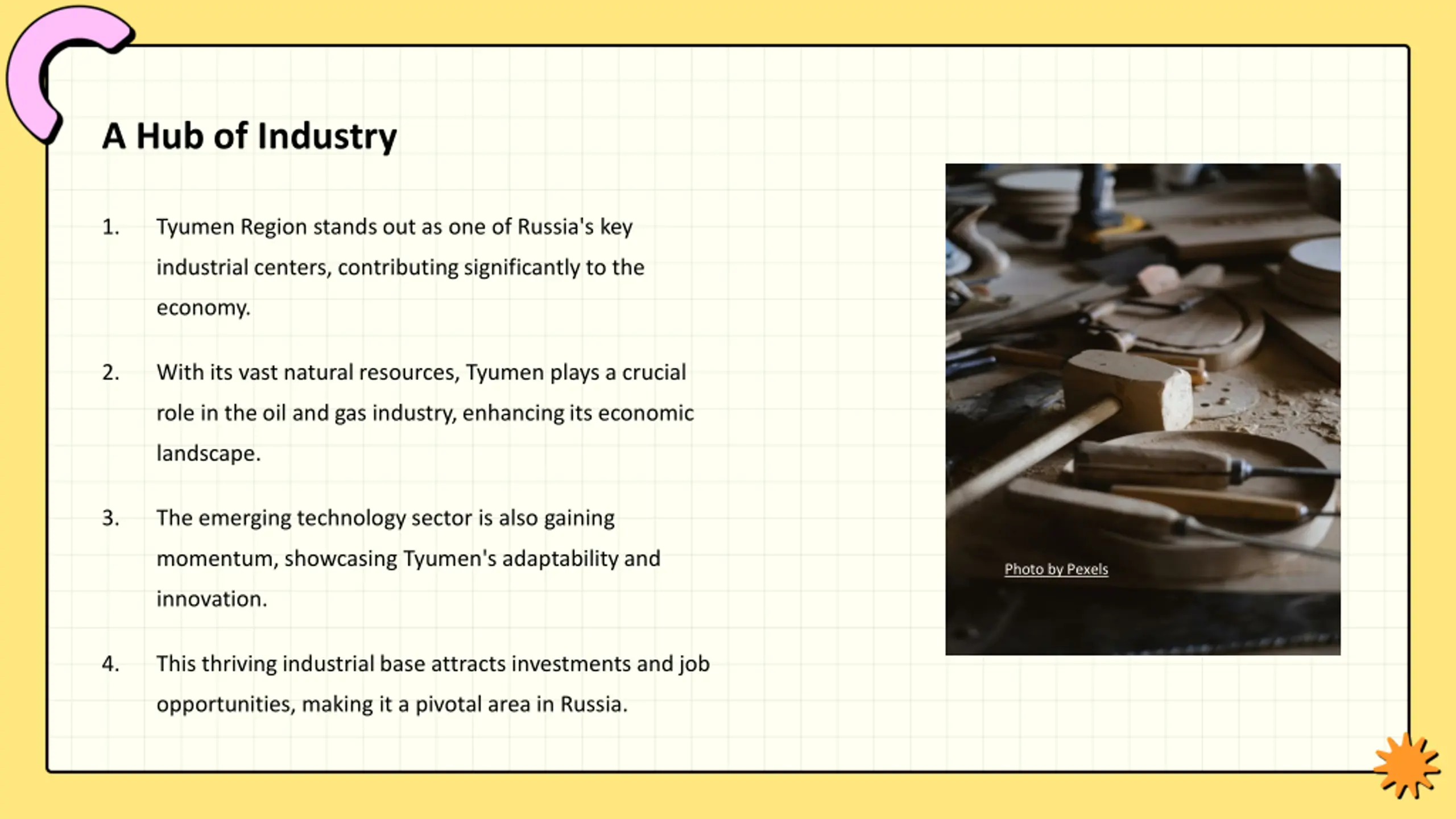 A Hub of Industry 1. Tyumen Region stands out as one of Russia's key industrial centers, contributing significantly to the economy. 2. With its vast natural resources, Tyumen plays a crucial role in the oil and gas industry, enhancing its economic landscape. 3. The emerging technology sector is also gaining momentum, showcasing Tyumen's adaptability and Photo by Pexels innovation. 4. This thriving industrial base attracts investments and job opportunities, making it a pivotal area in Russia.