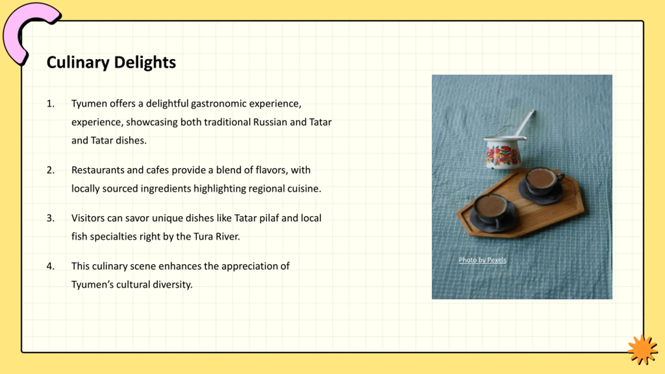 Culinary Delights 1. Tyumen offers a delightful gastronomic experience, experience, showcasing both traditional Russian and Tatar and Tatar dishes. 2. Restaurants and cafes provide a blend of flavors, with locally sourced ingredients highlighting regional cuisine. 3. Visitors can savor unique dishes like Tatar pilaf and local fish specialties right by the Tura River. Photo by Pexels 4. This culinary scene enhances the appreciation of Tyumen s cultural diversity.