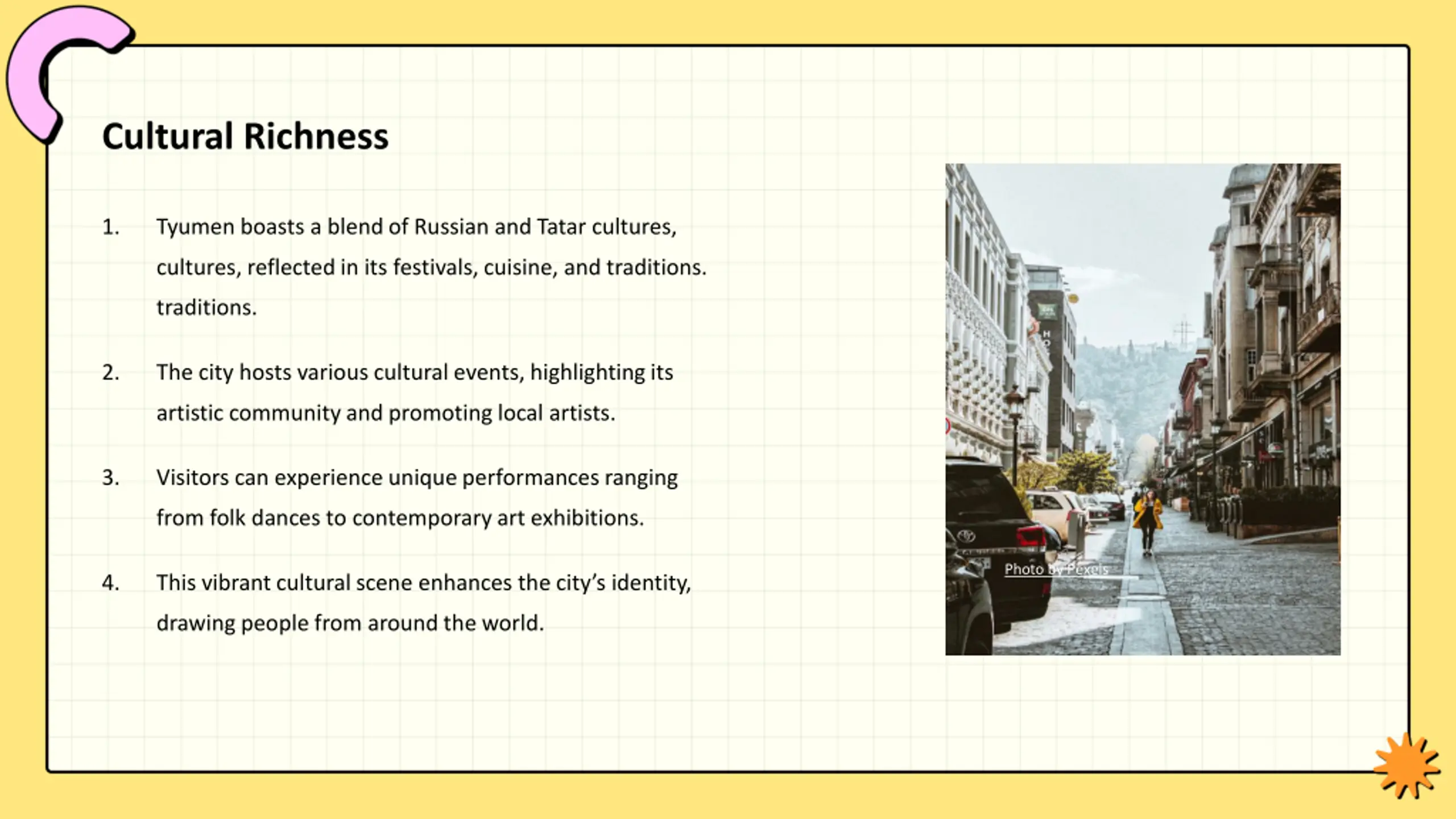 Cultural Richness 1. Tyumen boasts a blend of Russian and Tatar cultures, cultures, reflected in its festivals, cuisine, and traditions. traditions. 2. The city hosts various cultural events, highlighting its artistic community and promoting local artists. 3. Visitors can experience unique performances ranging from folk dances to contemporary art exhibitions. Photo by Pexels 4. This vibrant cultural scene enhances the city s identity, drawing people from around the world.