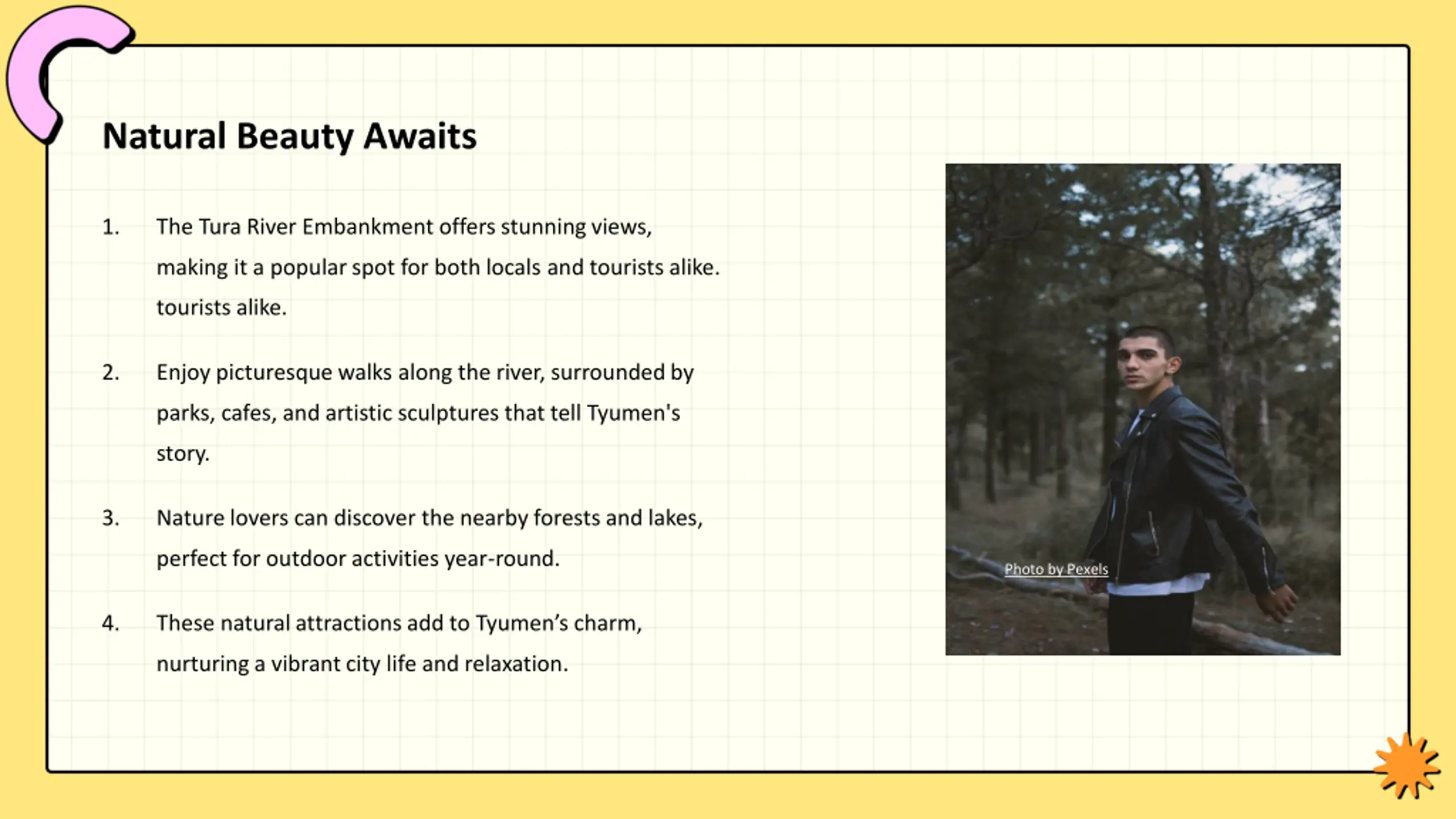 Natural Beauty Awaits 1. The Tura River Embankment offers stunning views, making it a popular spot for both locals and tourists alike. tourists alike. 2. Enjoy picturesque walks along the river, surrounded by parks, cafes, and artistic sculptures that tell Tyumen's story. 3. Nature lovers can discover the nearby forests and lakes, perfect for outdoor activities year-round. Photo by Pexels 4. These natural attractions add to Tyumen s charm, nurturing a vibrant city life and relaxation.