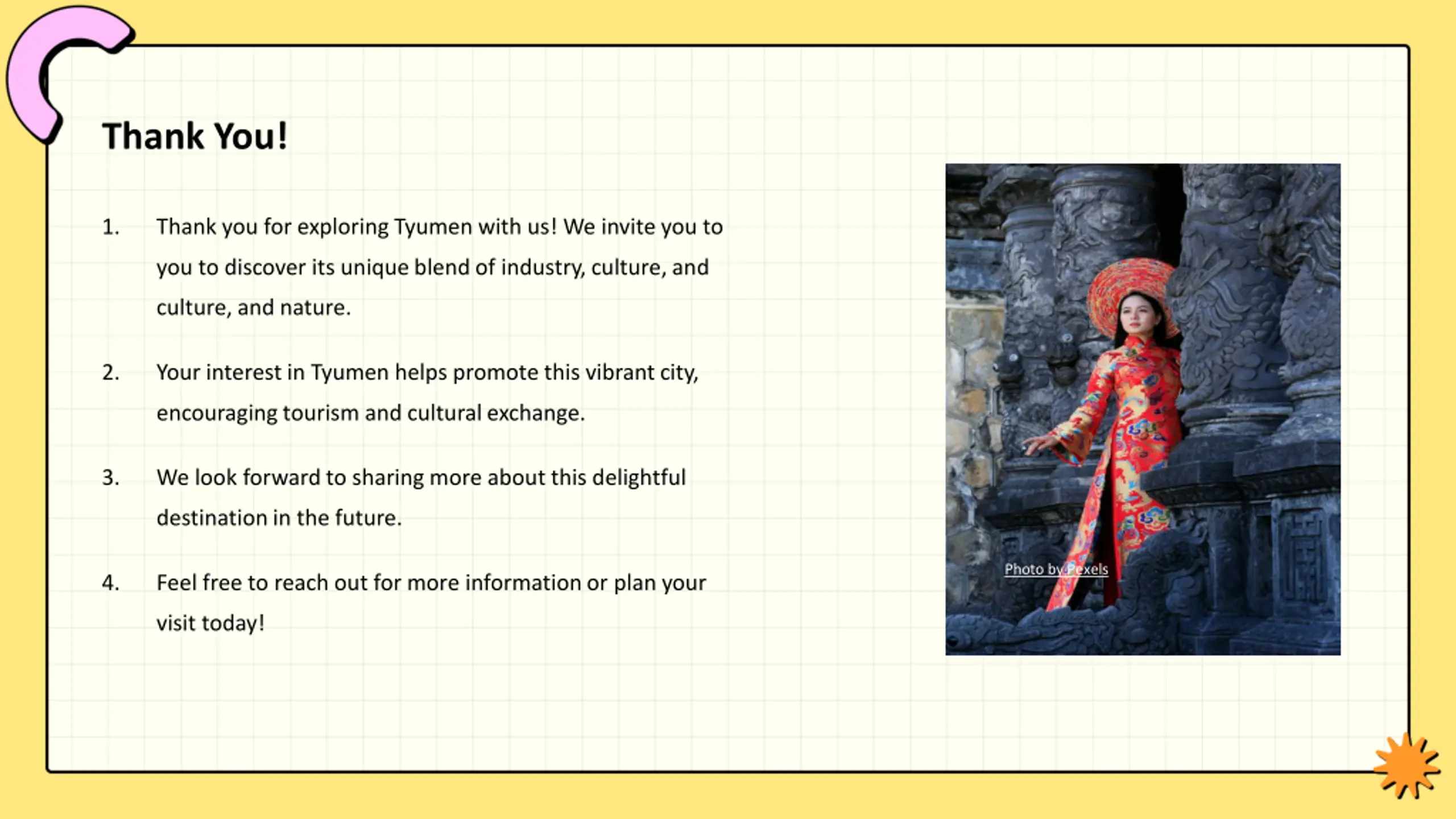 Thank You! 1. Thank you for exploring Tyumen with us! We invite you to you to discover its unique blend of industry, culture, and culture, and nature. 2. Your interest in Tyumen helps promote this vibrant city, encouraging tourism and cultural exchange. 3. We look forward to sharing more about this delightful destination in the future. Photo by Pexels 4. Feel free to reach out for more information or plan your visit today!