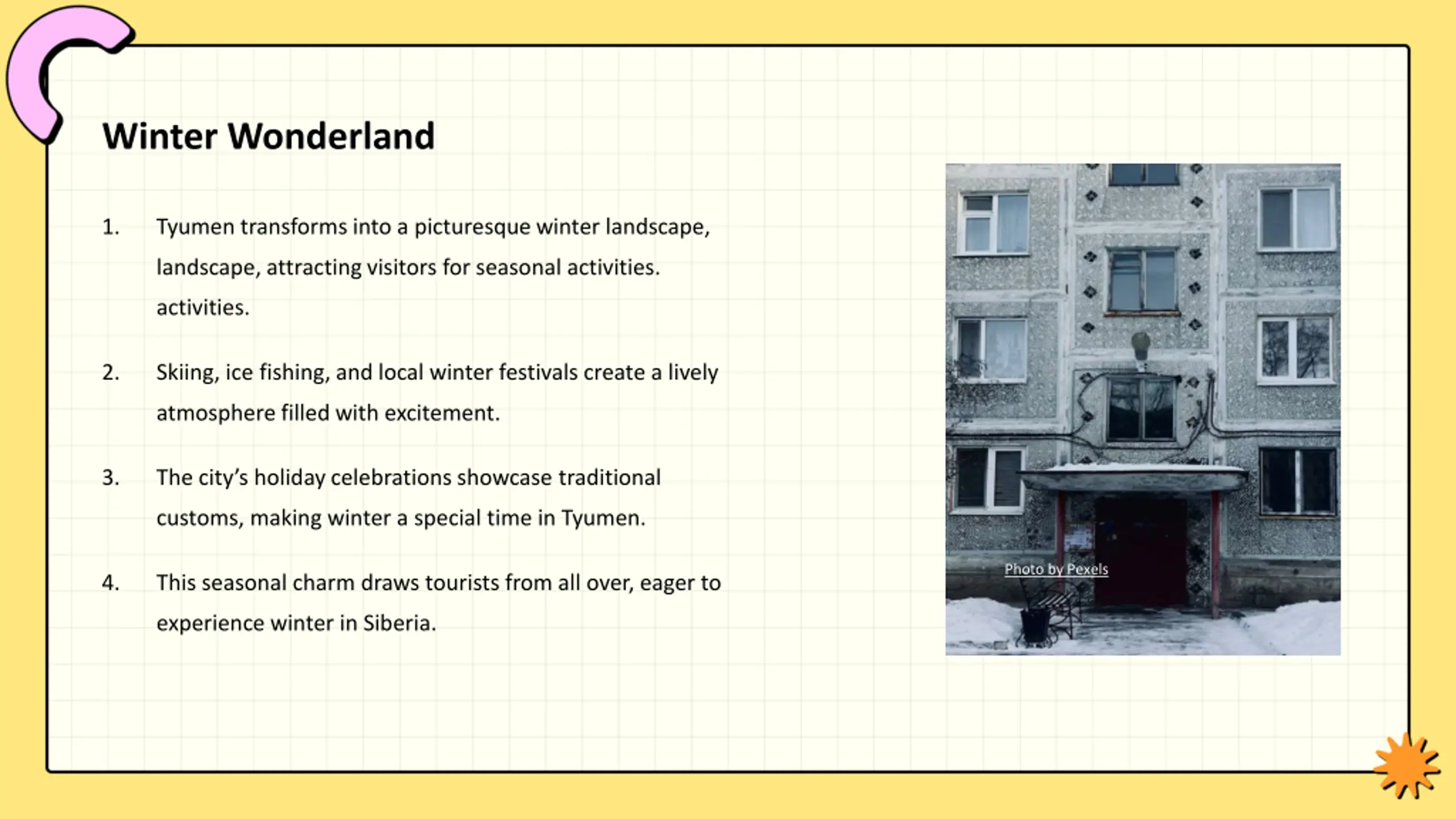 Winter Wonderland 1. Tyumen transforms into a picturesque winter landscape, landscape, attracting visitors for seasonal activities. activities. 2. Skiing, ice fishing, and local winter festivals create a lively atmosphere filled with excitement. 3. The city s holiday celebrations showcase traditional customs, making winter a special time in Tyumen. Photo by Pexels 4. This seasonal charm draws tourists from all over, eager to experience winter in Siberia.