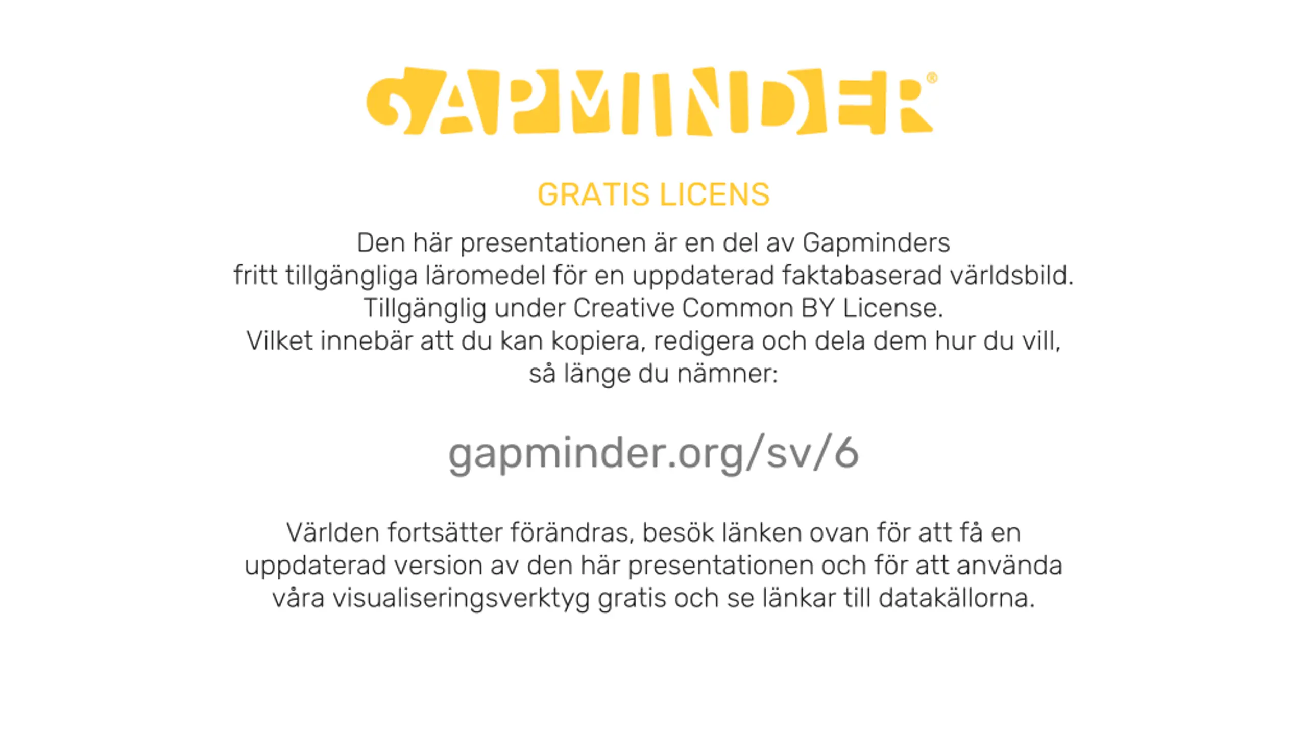 GRATIS LICENS Den h r presentationen r en del av Gapminders fritt tillg ngliga l romedel f r en uppdaterad faktabaserad v rldsbild. Tillg nglig under Creative Common BY License. Vilket inneb r att du kan kopiera, redigera och dela dem hur du vill, s l nge du n mner: gapminder.org/sv/6 V rlden forts tter f r ndras, bes k l nken ovan f r att f en uppdaterad version av den h r presentationen och f r att anv nda v ra visualiseringsverktyg gratis och se l nkar till datak llorna.