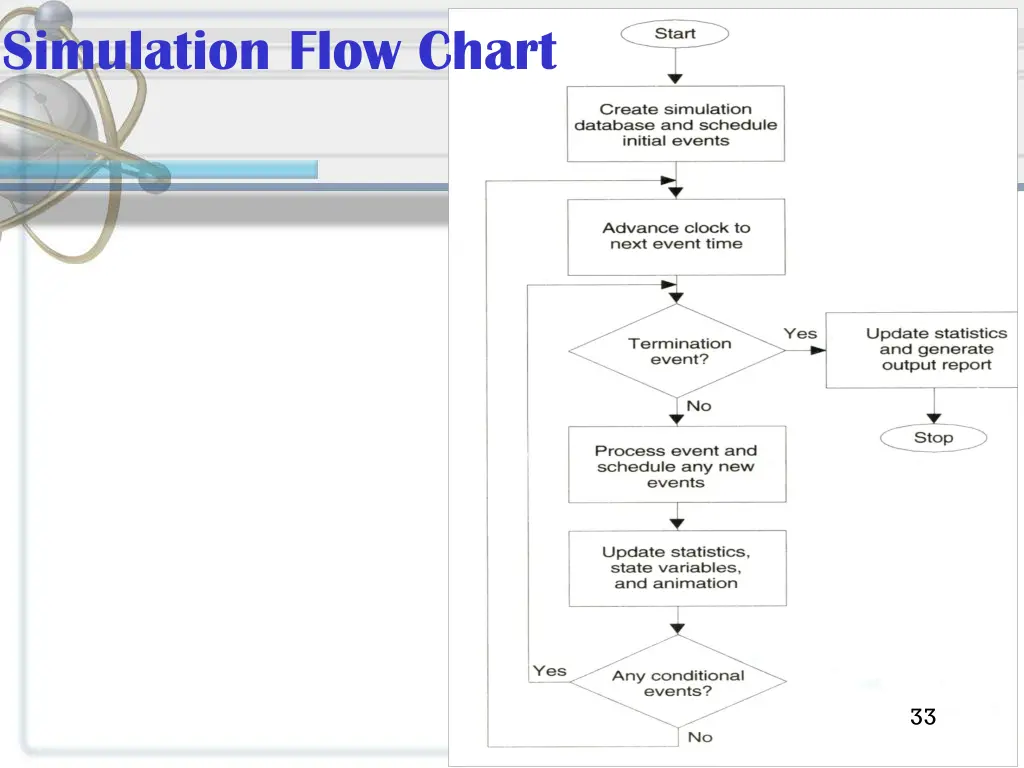 Simulation Development Events Stochastic model and system attributes System States Relationship among events Time handling Output statistics 31