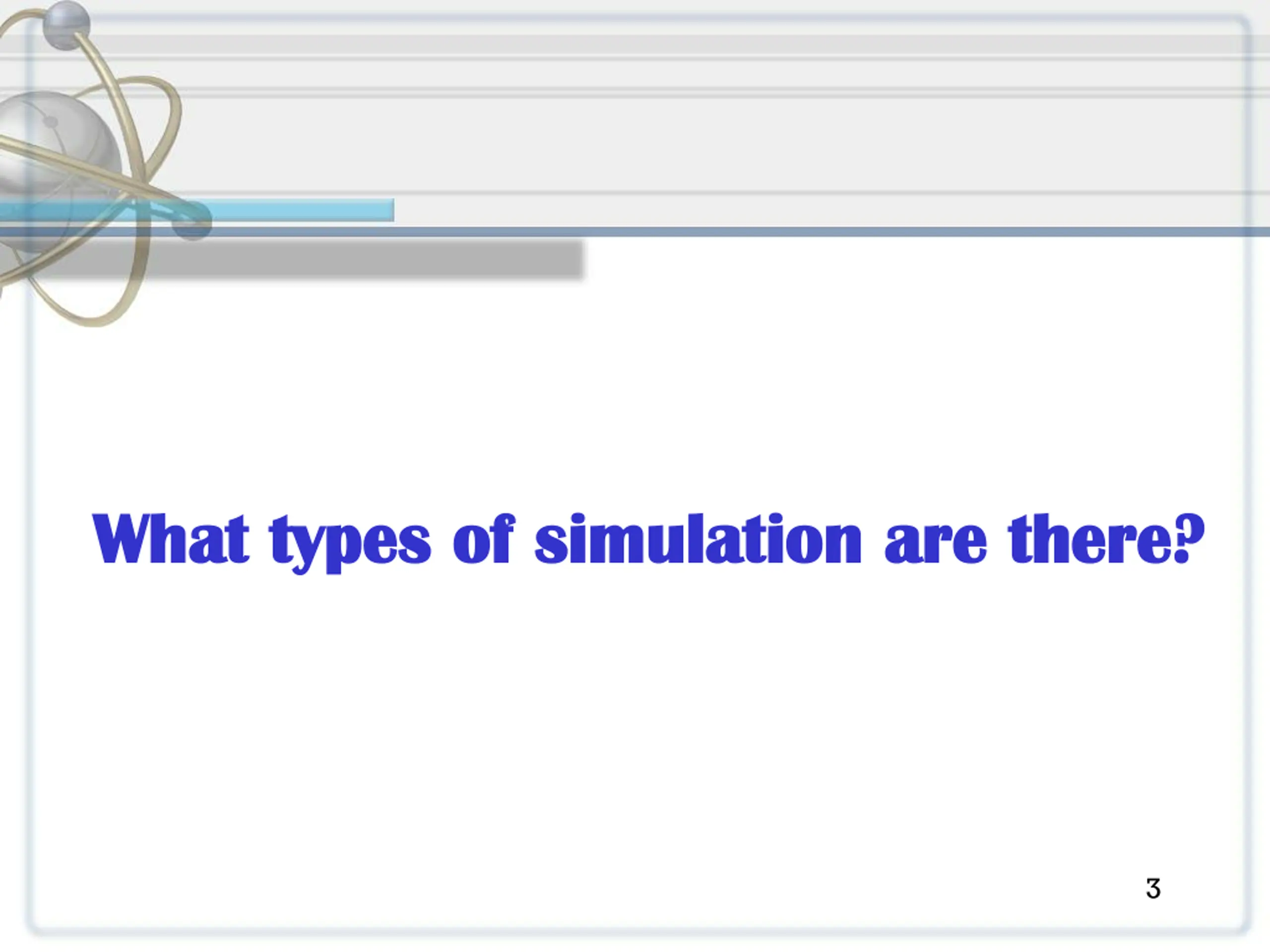 Simulation Types 1. Static or dynamic models 2. Stochastic or deterministic models 3. Discrete or continuous models 4