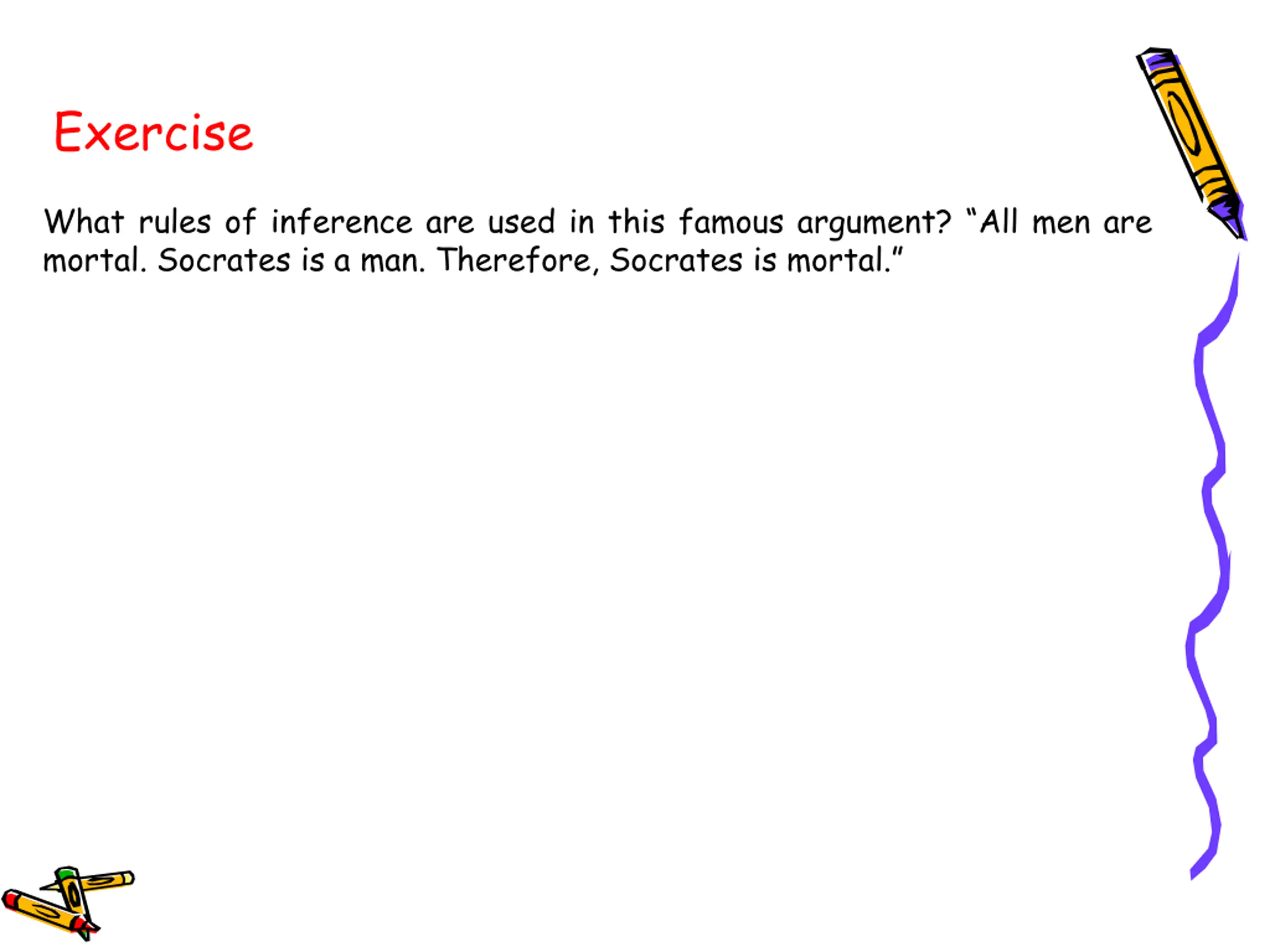 Exercise What rules of inference are used in this famous argument? All men are mortal. Socrates is a man. Therefore, Socrates is mortal.