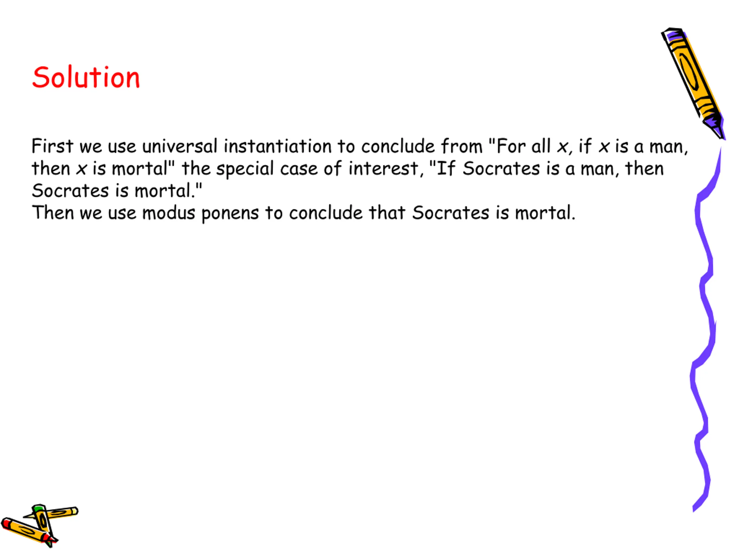 Solution First we use universal instantiation to conclude from "For all x, if x is a man, then x is mortal" the special case of interest, "If Socrates is a man, then Socrates is mortal." Then we use modus ponens to conclude that Socrates is mortal.
