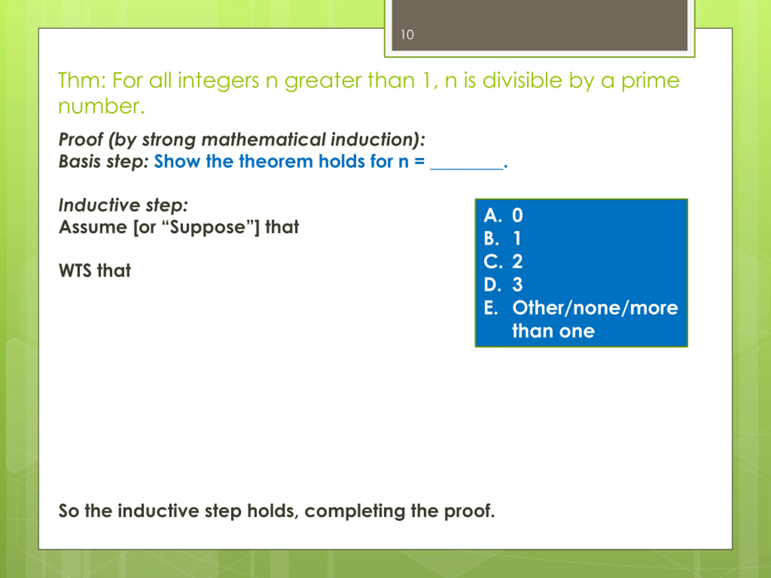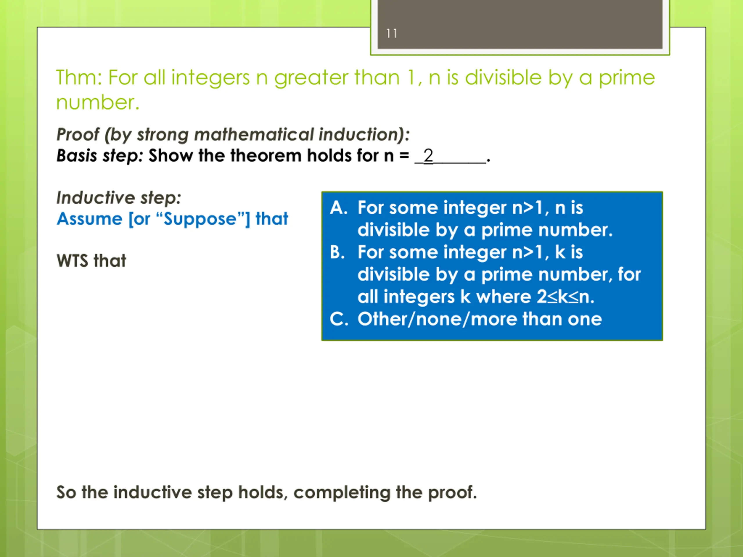10 Thm: For all integers n greater than 1, n is divisible by a prime number. Proof (by strong mathematical induction): Basis step: Show the theorem holds for n = ________. Inductive step: Assume [or Suppose ] that A. 0 B. 1 C. 2 D. 3 E. Other/none/more than one WTS that So the inductive step holds, completing the proof.