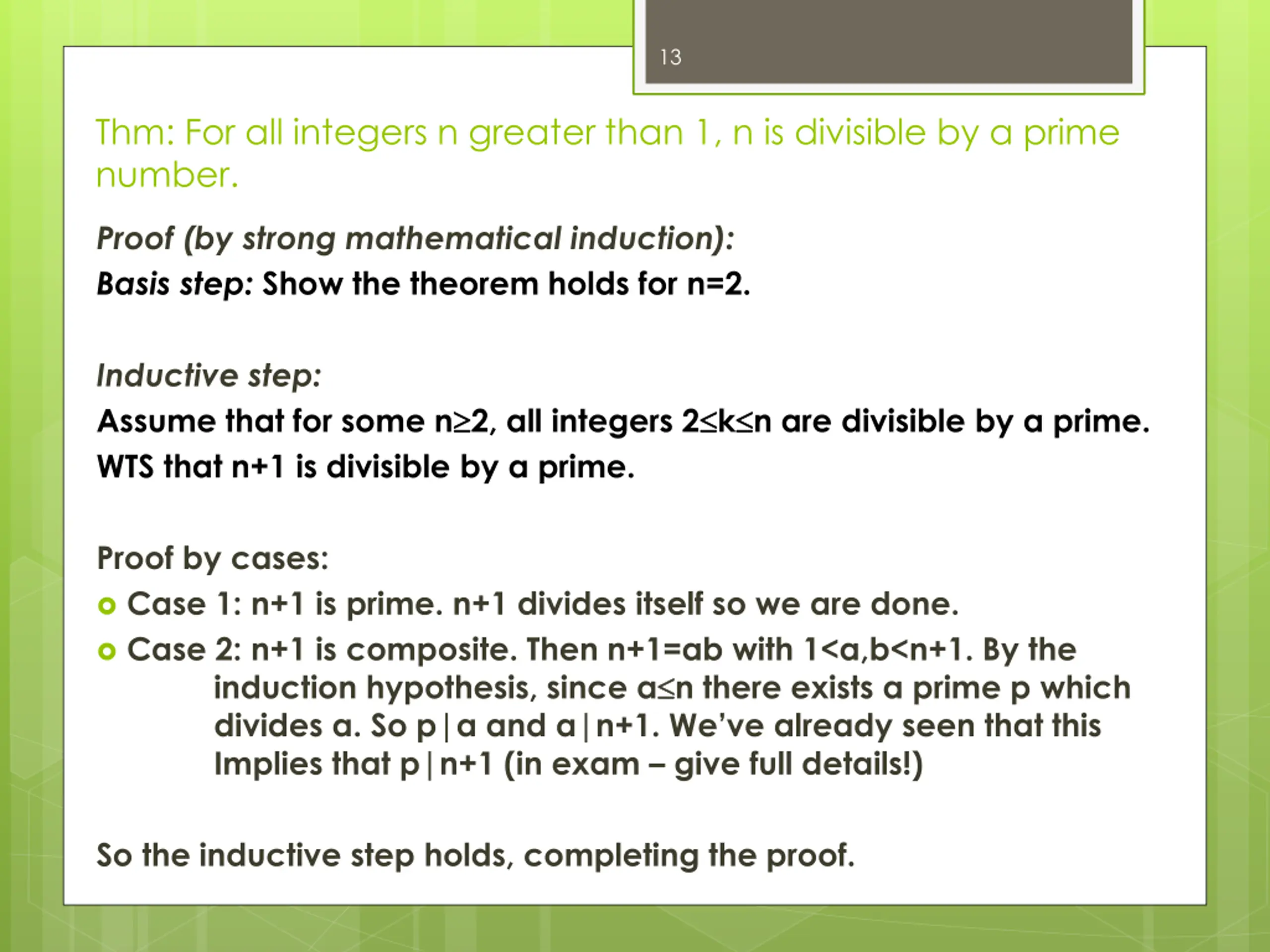 13 Thm: For all integers n greater than 1, n is divisible by a prime number. Proof (by strong mathematical induction): Basis step: Show the theorem holds for n=2. Inductive step: Assume that for some n 2, all integers 2 k n are divisible by a prime. WTS that n+1 is divisible by a prime. Proof by cases: Case 1: n+1 is prime. n+1 divides itself so we are done. Case 2: n+1 is composite. Then n+1=ab with 1<a,b<n+1. By the induction hypothesis, since a n there exists a prime p which divides a. So p|a and a|n+1. We ve already seen that this Implies that p|n+1 (in exam give full details!) So the inductive step holds, completing the proof.