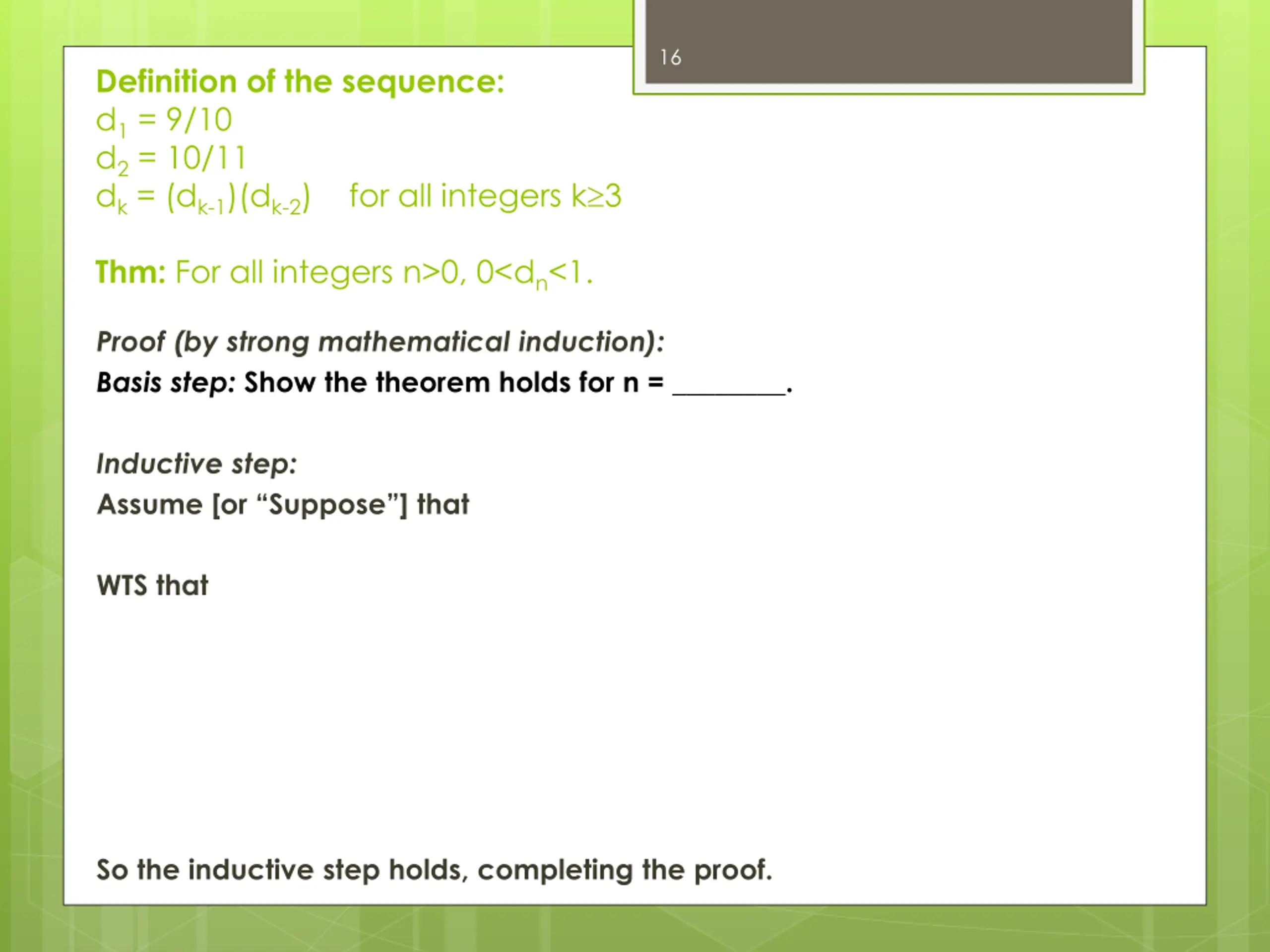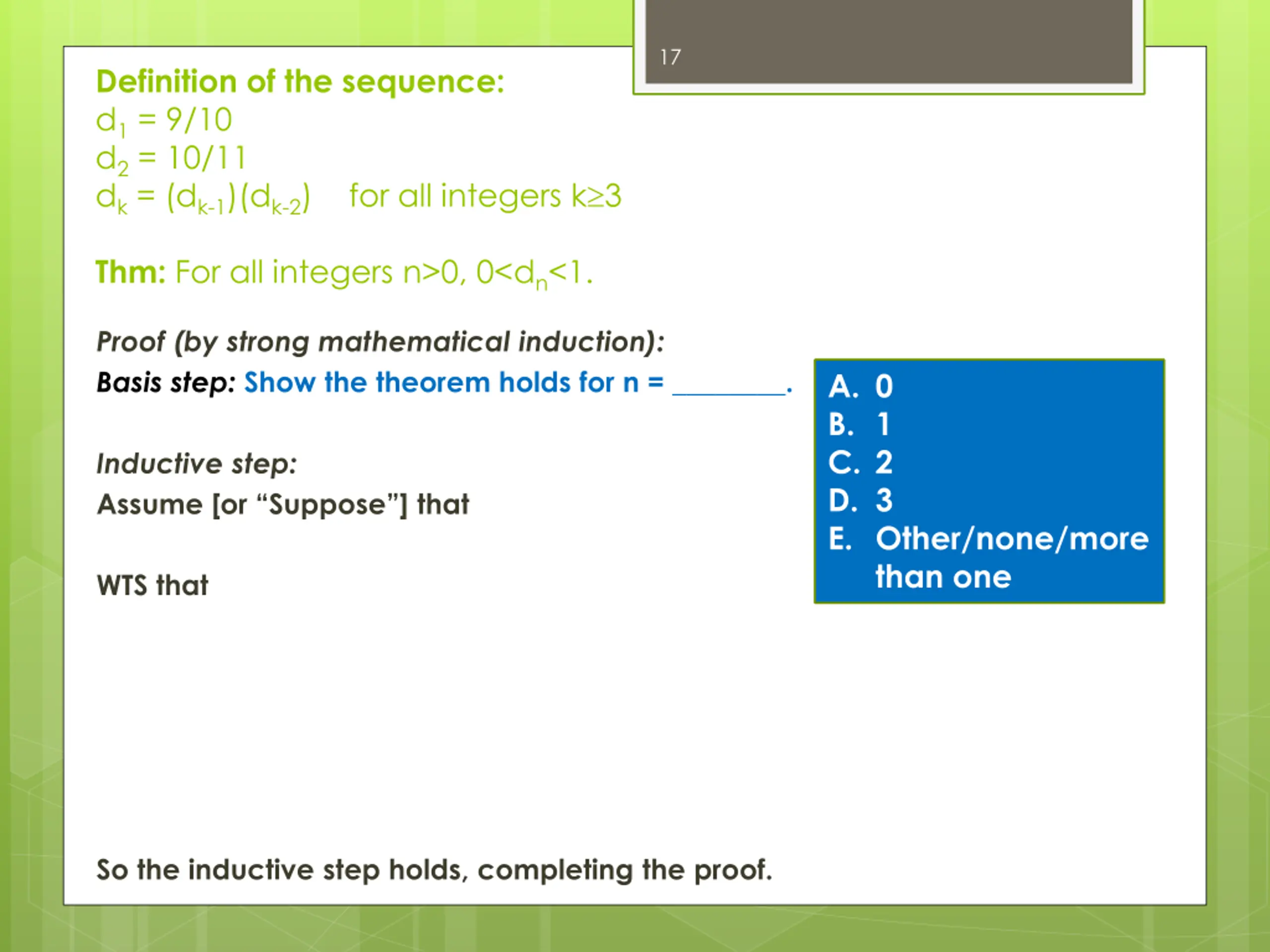 16 Definition of the sequence: d1 = 9/10 d2 = 10/11 dk = (dk-1)(dk-2) for all integers k 3 Thm: For all integers n>0, 0<dn<1. Proof (by strong mathematical induction): Basis step: Show the theorem holds for n = ________. Inductive step: Assume [or Suppose ] that WTS that So the inductive step holds, completing the proof.