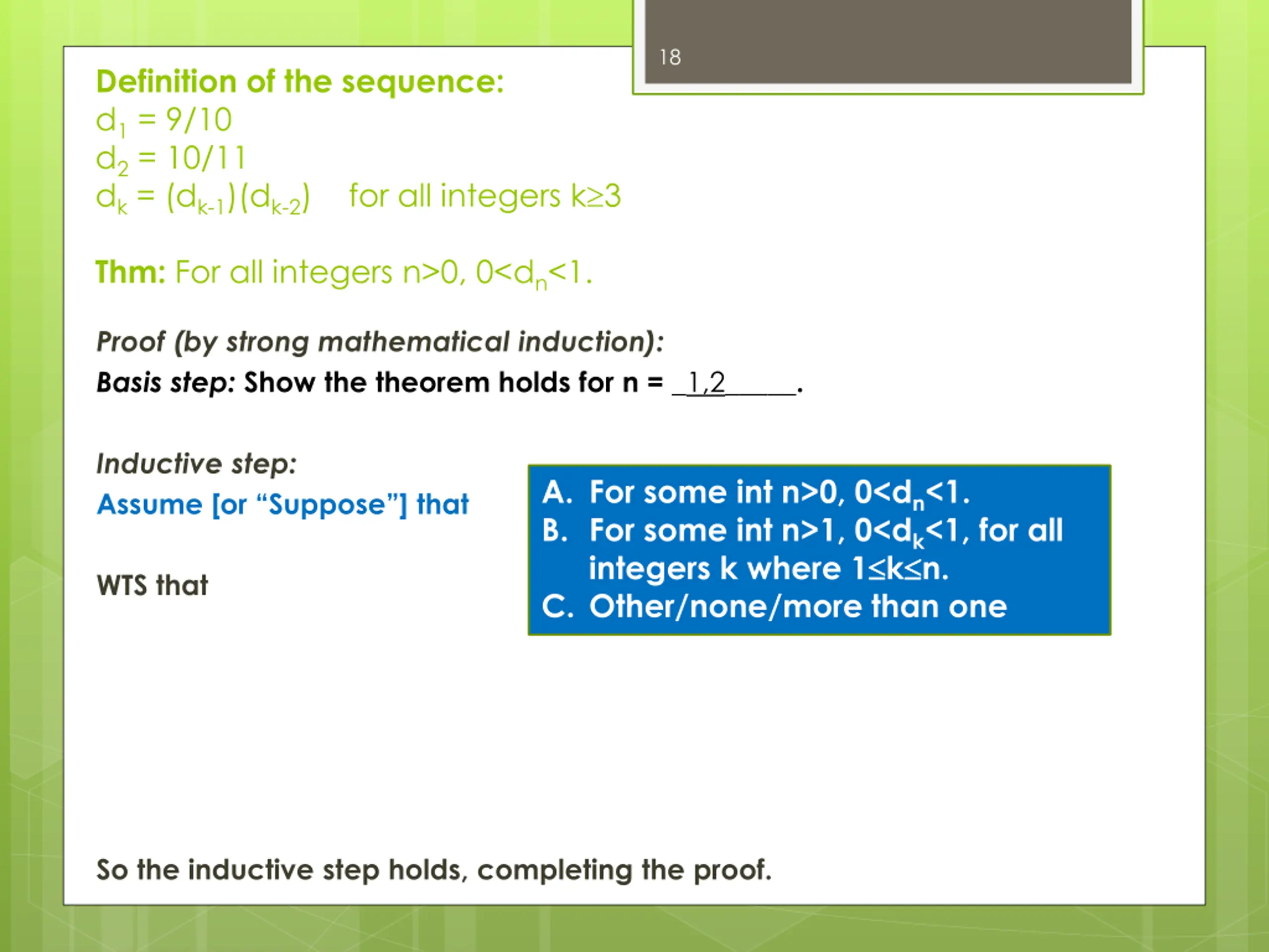 17 Definition of the sequence: d1 = 9/10 d2 = 10/11 dk = (dk-1)(dk-2) for all integers k 3 Thm: For all integers n>0, 0<dn<1. Proof (by strong mathematical induction): Basis step: Show the theorem holds for n = ________. Inductive step: Assume [or Suppose ] that A. 0 B. 1 C. 2 D. 3 E. Other/none/more than one WTS that So the inductive step holds, completing the proof.