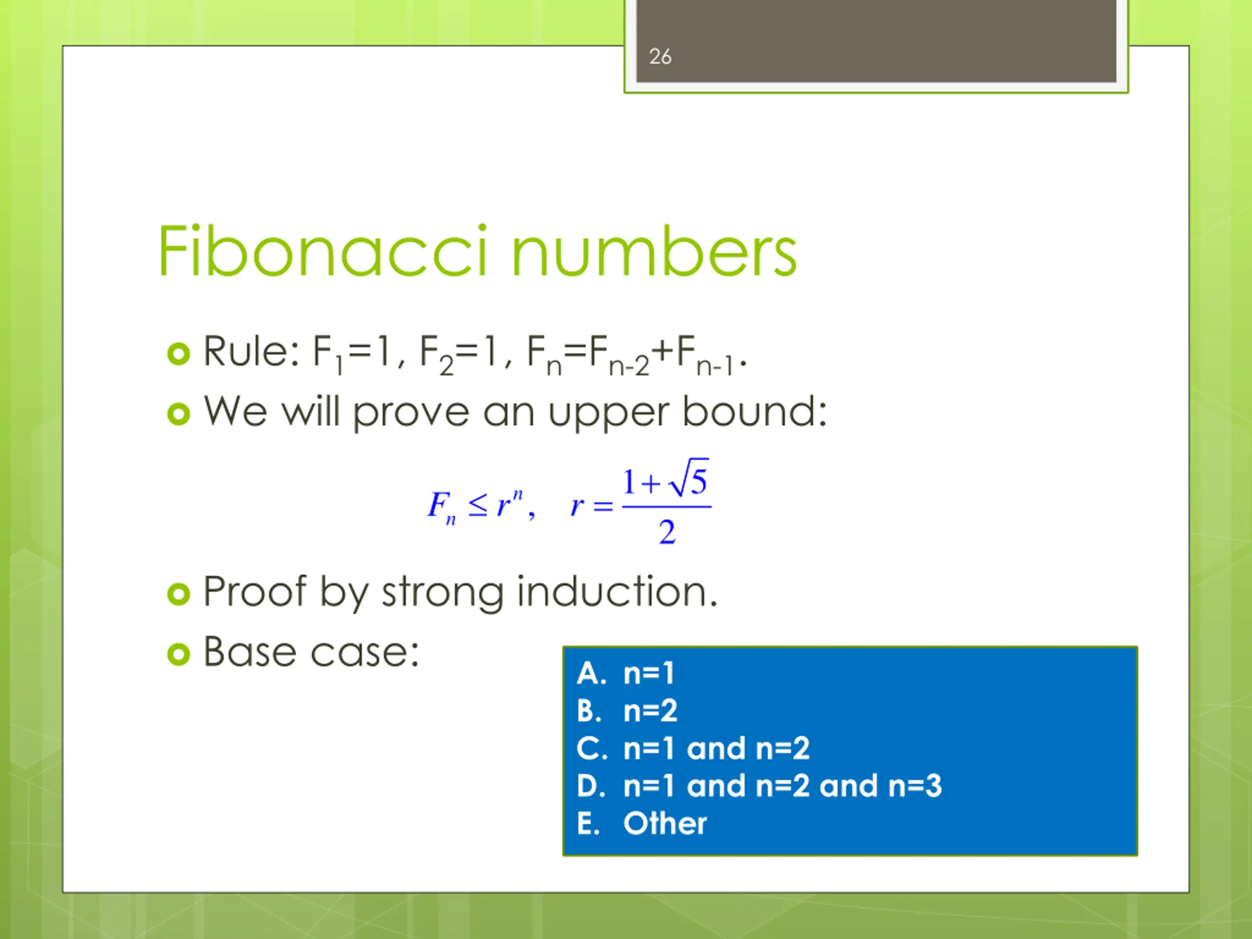 27 Fibonacci numbers Rule: F1=1, F2=1, Fn=Fn-2+Fn-1. We will prove an upper bound: + 1 5 = n , n F r r 2 Proof by strong induction. Base case: A. n=1 B. n=2 C. n=1 and n=2 D. n=1 and n=2 and n=3 E. Other