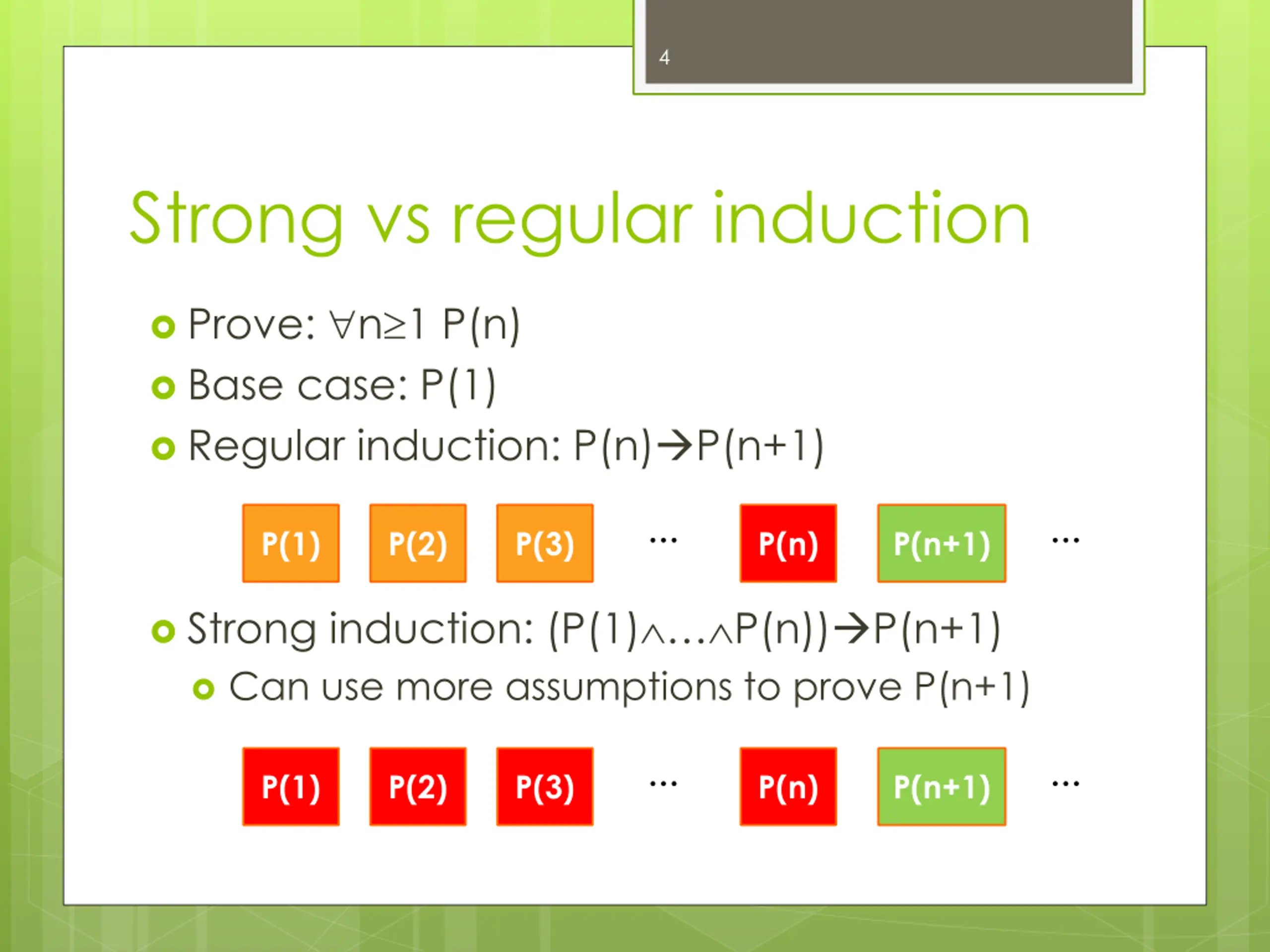 4 Strong vs regular induction Prove: n 1 P(n) Base case: P(1) Regular induction: P(n) P(n+1) P(1) P(2) P(3) P(n) P(n+1) Strong induction: (P(1) P(n)) P(n+1) Can use more assumptions to prove P(n+1) P(1) P(2) P(3) P(n) P(n+1)