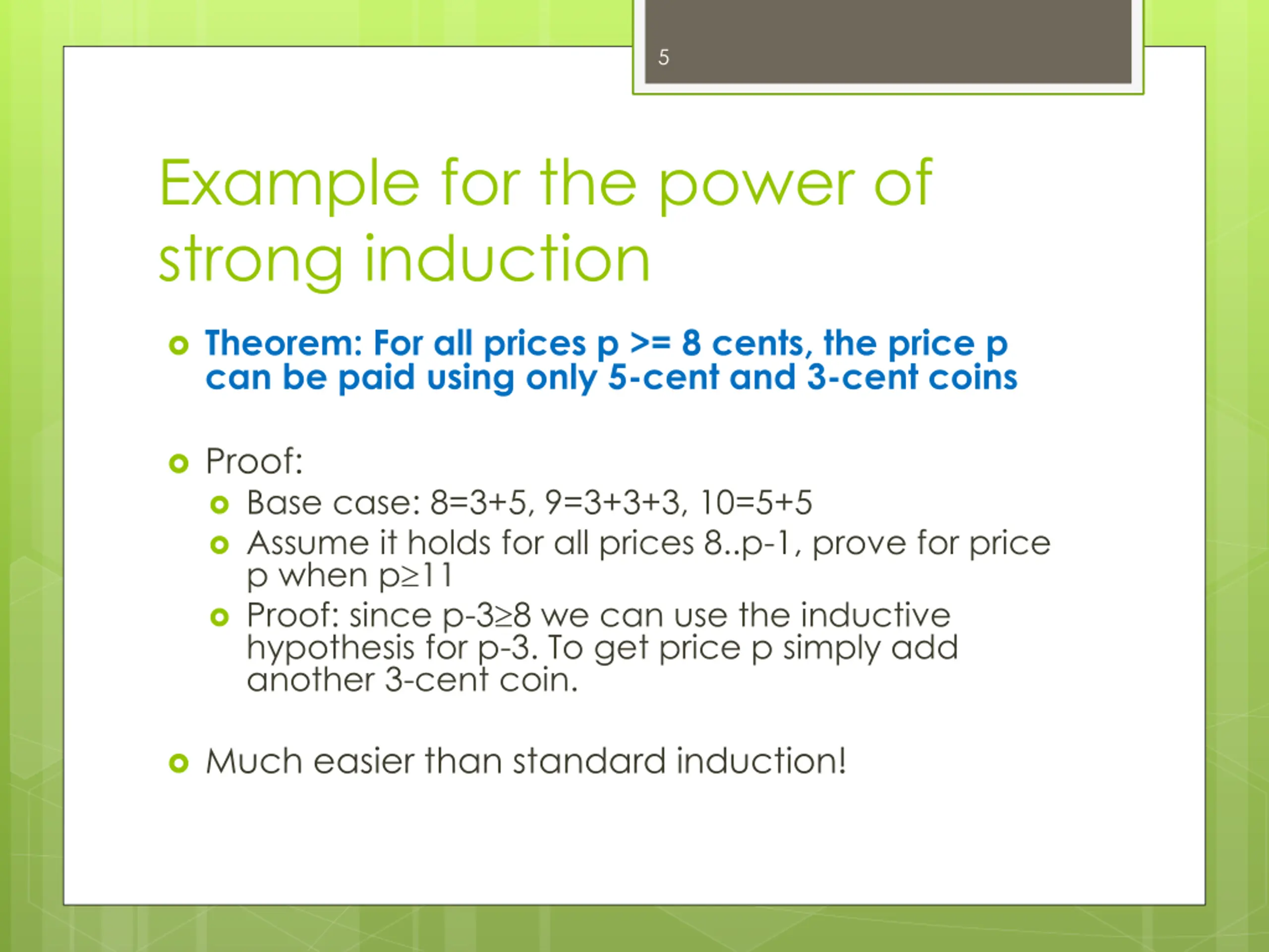 5 Example for the power of strong induction Theorem: For all prices p >= 8 cents, the price p can be paid using only 5-cent and 3-cent coins Proof: Base case: 8=3+5, 9=3+3+3, 10=5+5 Assume it holds for all prices 8..p-1, prove for price p when p 11 Proof: since p-3 8 we can use the inductive hypothesis for p-3. To get price p simply add another 3-cent coin. Much easier than standard induction!