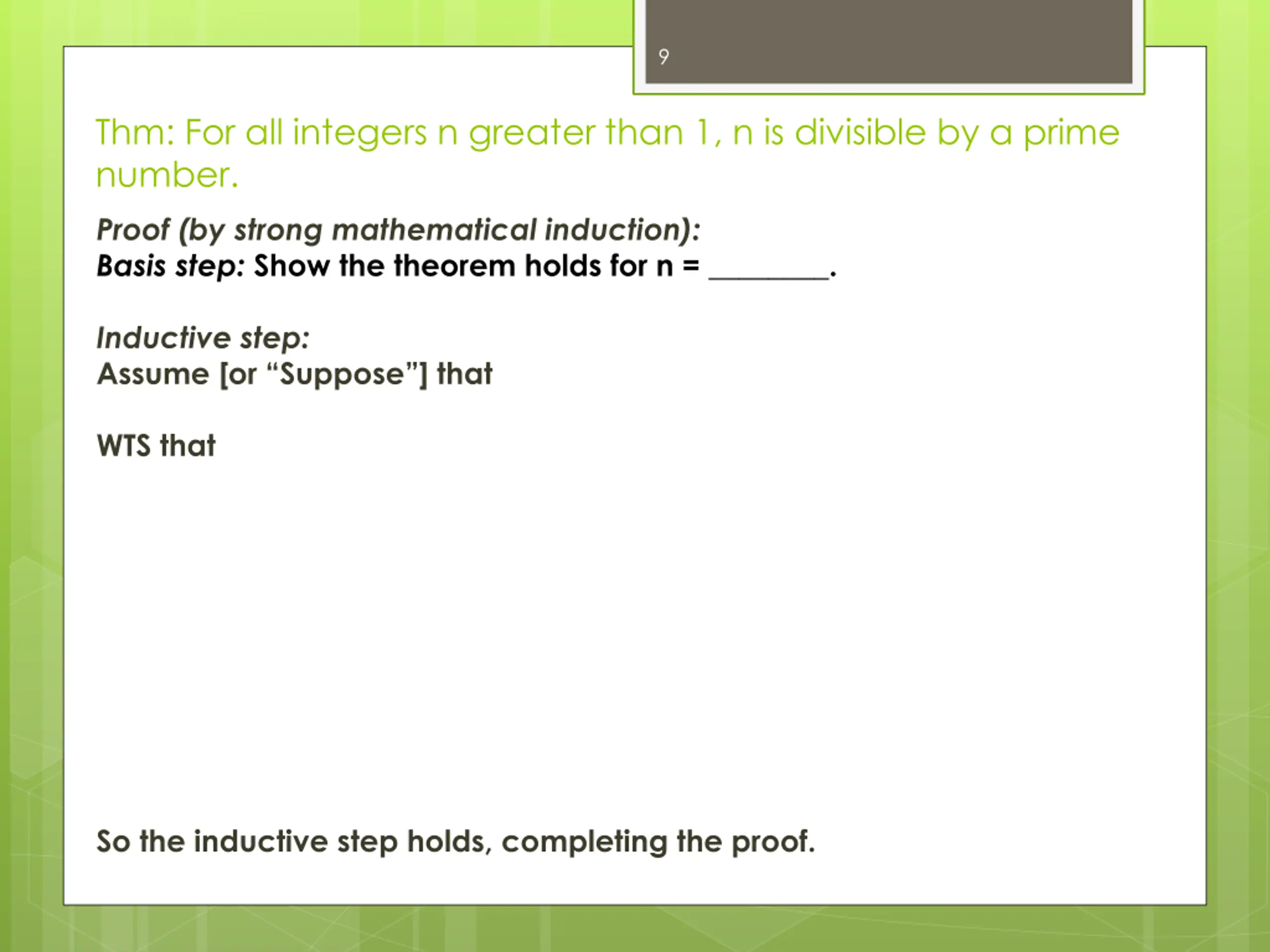 9 Thm: For all integers n greater than 1, n is divisible by a prime number. Proof (by strong mathematical induction): Basis step: Show the theorem holds for n = ________. Inductive step: Assume [or Suppose ] that WTS that So the inductive step holds, completing the proof.