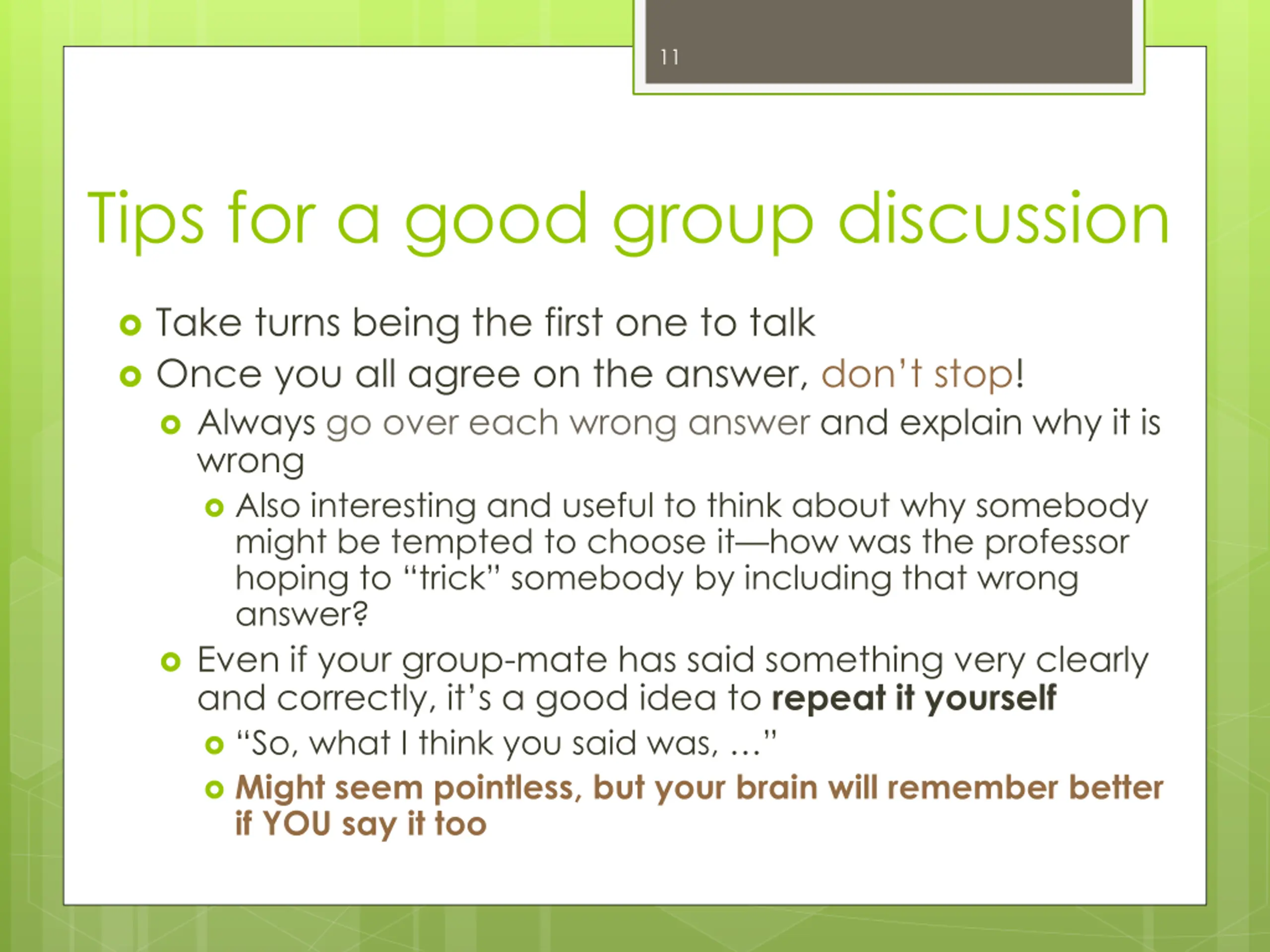 11 Tips for a good group discussion Take turns being the first one to talk Once you all agree on the answer, don t stop! Always go over each wrong answer and explain why it is wrong Also interesting and useful to think about why somebody might be tempted to choose it how was the professor hoping to trick somebody by including that wrong answer? Even if your group-mate has said something very clearly and correctly, it s a good idea to repeat it yourself So, what I think you said was, Might seem pointless, but your brain will remember better if YOU say it too