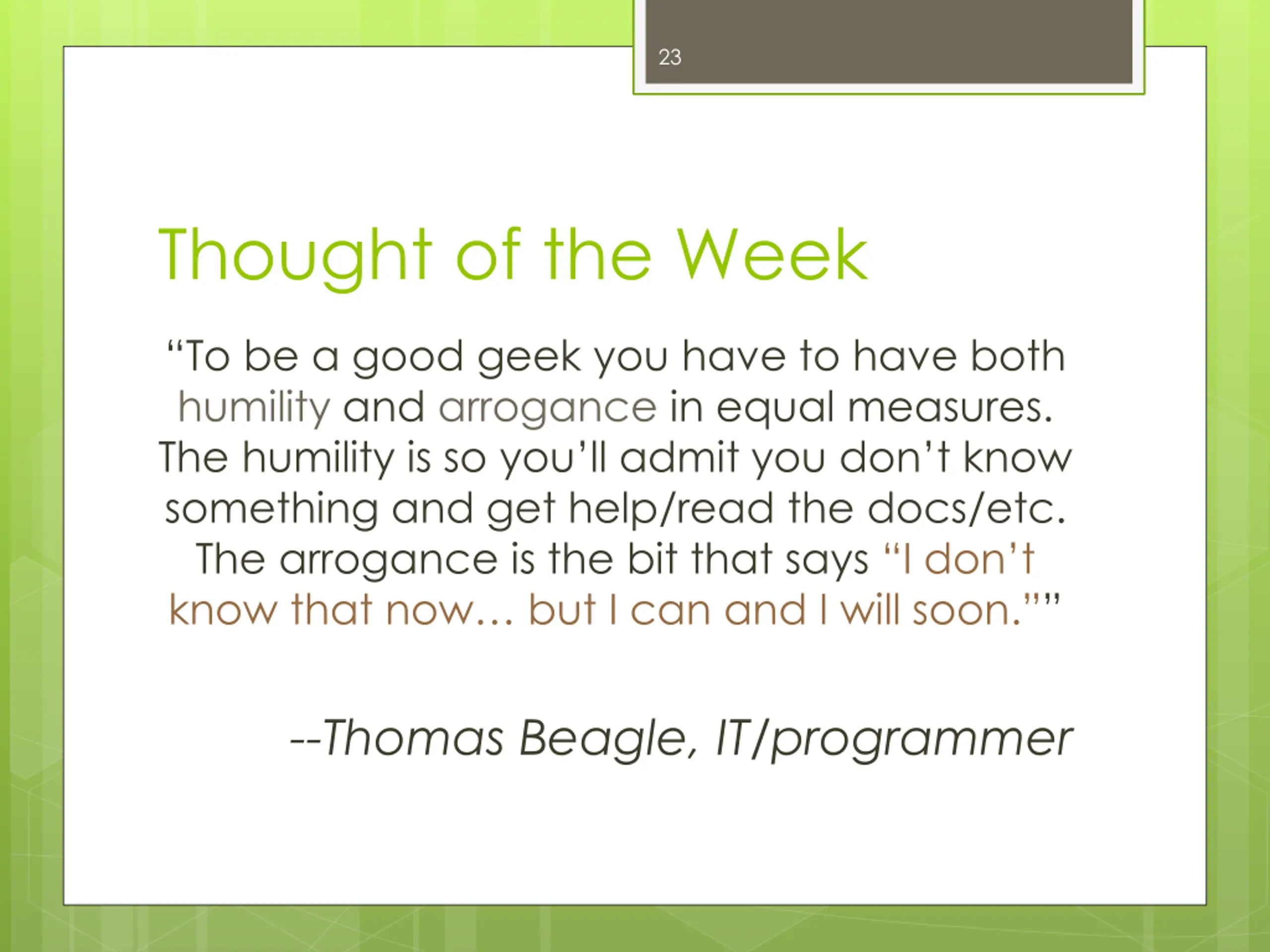 23 Thought of the Week To be a good geek you have to have both humility and arrogance in equal measures. The humility is so you ll admit you don t know something and get help/read the docs/etc. The arrogance is the bit that says I don t know that now but I can and I will soon. --Thomas Beagle, IT/programmer