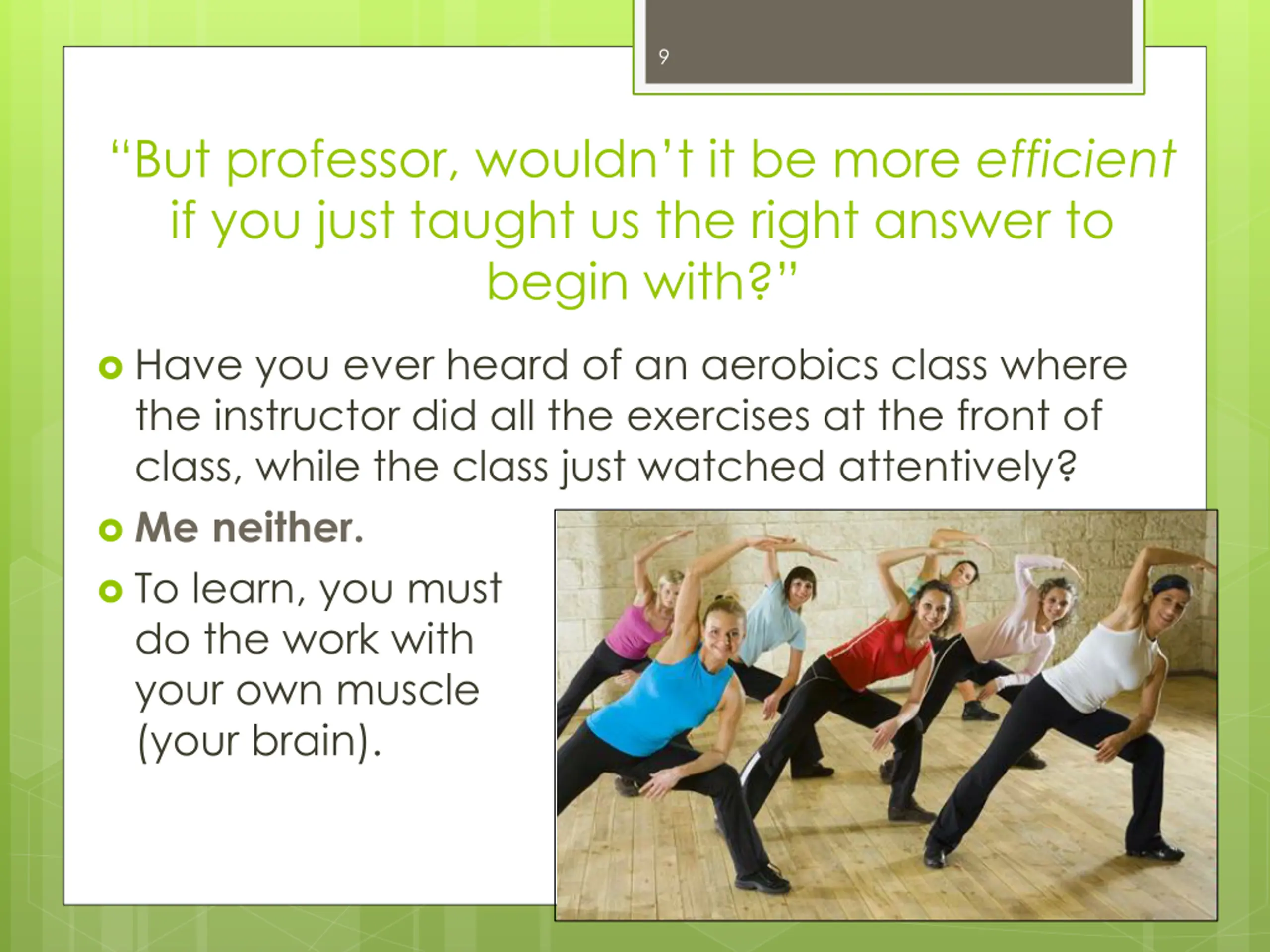 9 But professor, wouldn t it be more efficient if you just taught us the right answer to begin with? Have you ever heard of an aerobics class where the instructor did all the exercises at the front of class, while the class just watched attentively? Me neither. To learn, you must do the work with your own muscle (your brain).