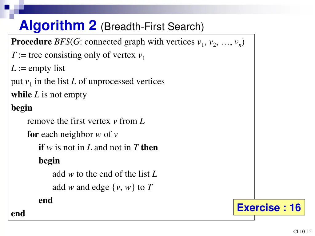 Algorithm 2 (Breadth-First Search) Procedure BFS(G: connected graph with vertices v1, v2, , vn) T := tree consisting only of vertex v1 L := empty list put v1in the list L of unprocessed vertices while L is not empty begin remove the first vertex v from L for each neighbor w of v if w is not in L and not in T then begin add w to the end of the list L add w and edge {v, w} to T end end Exercise : 16 Ch10-15