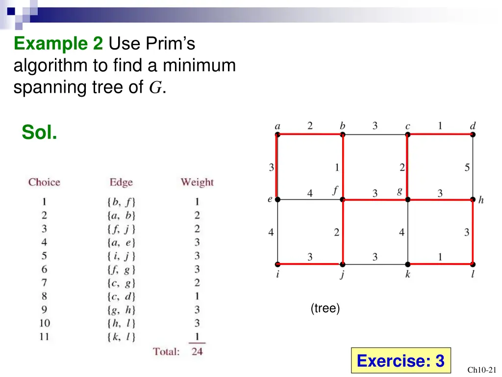 Example 2 Use Prims algorithm to find a minimum spanning tree of G. Sol. (tree) Exercise: 3 Ch10-21
