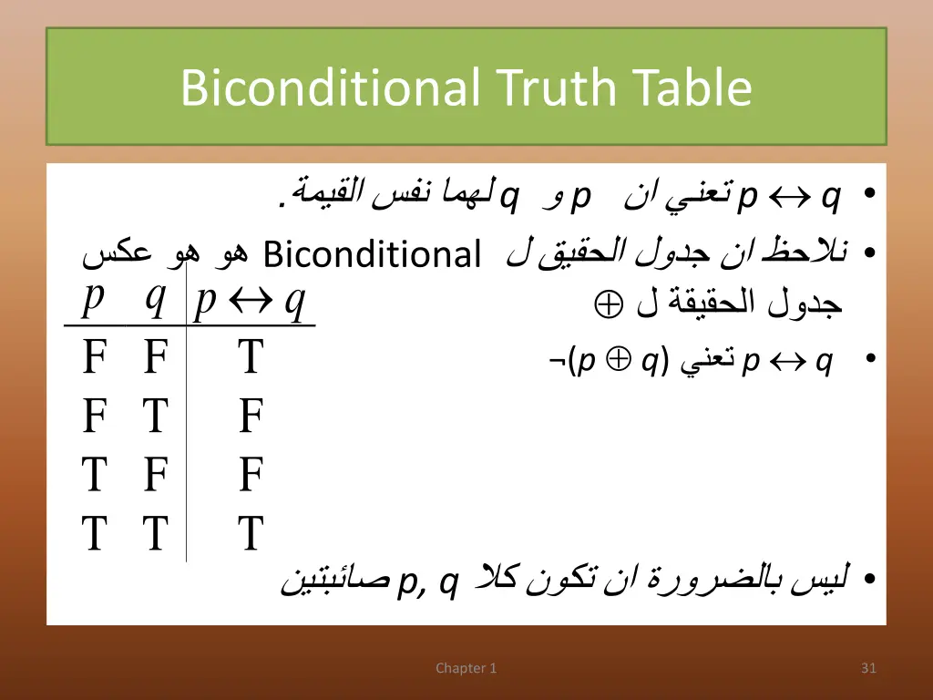 Biconditional Truth Table p q . Biconditional q (p q) p p q p q F F F T T F T T T F F T p q p, q Chapter 1 31