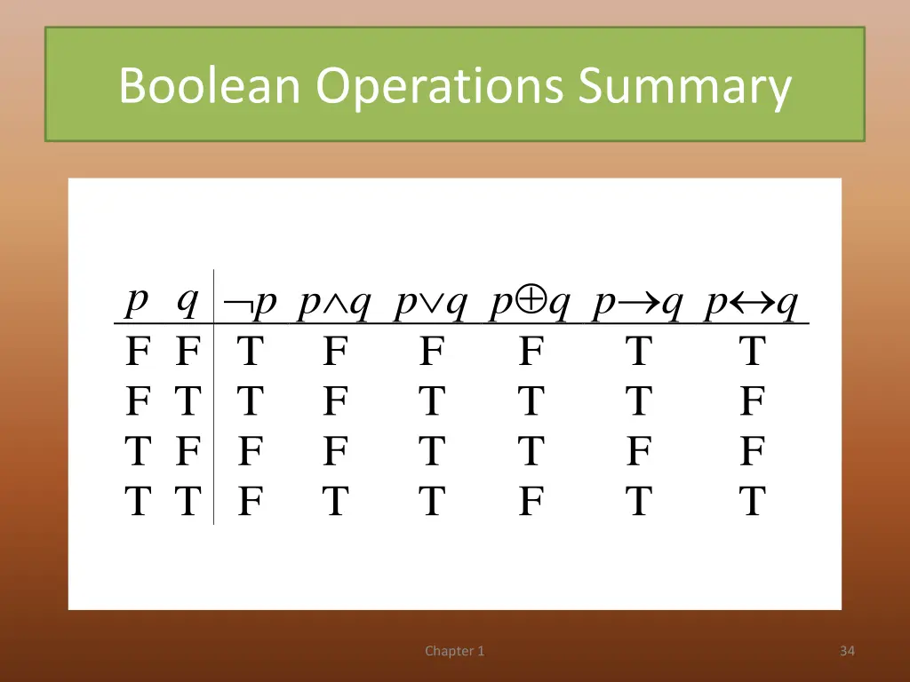 Boolean Operations Summary p q p p q p q p q p qp q F F T F F F T T F T T F F F T T T F T T F T T F T T F T T F F T Chapter 1 34
