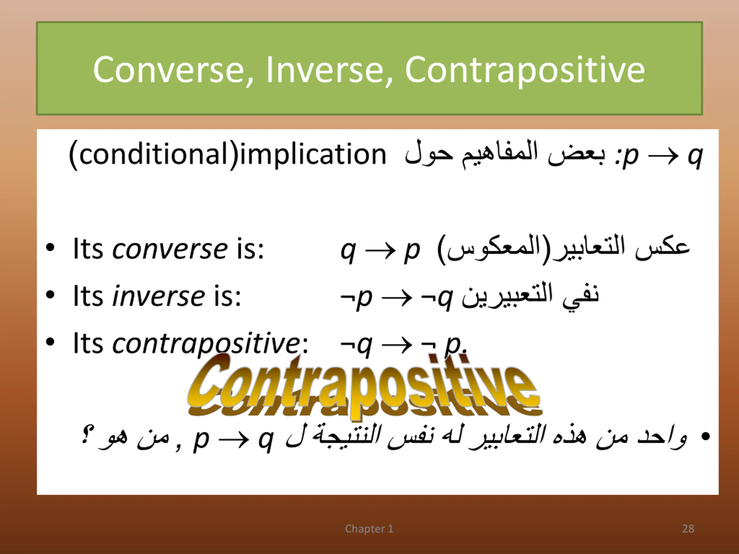 Converse, Inverse, Contrapositive :p q ) ( conditional implication q p p q Its converse is: Its inverse is: Its contrapositive: q p. Contrapositive ) ( p q , Chapter 1 28