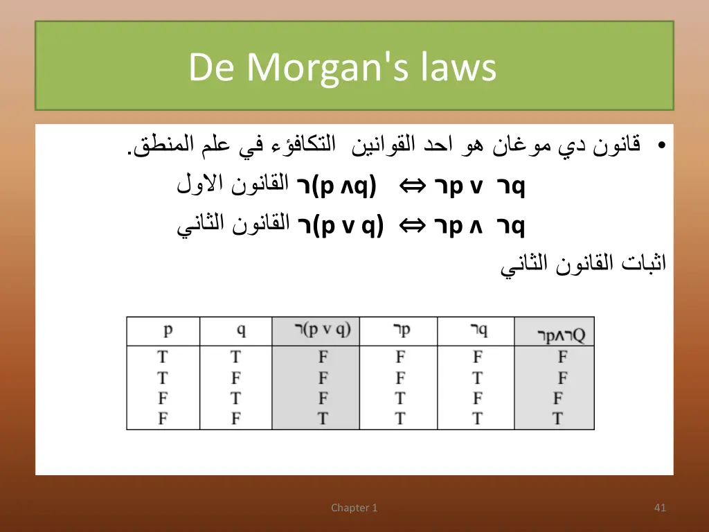 De Morgan's laws . (p q) (p v q) p v p q q Chapter 1 41