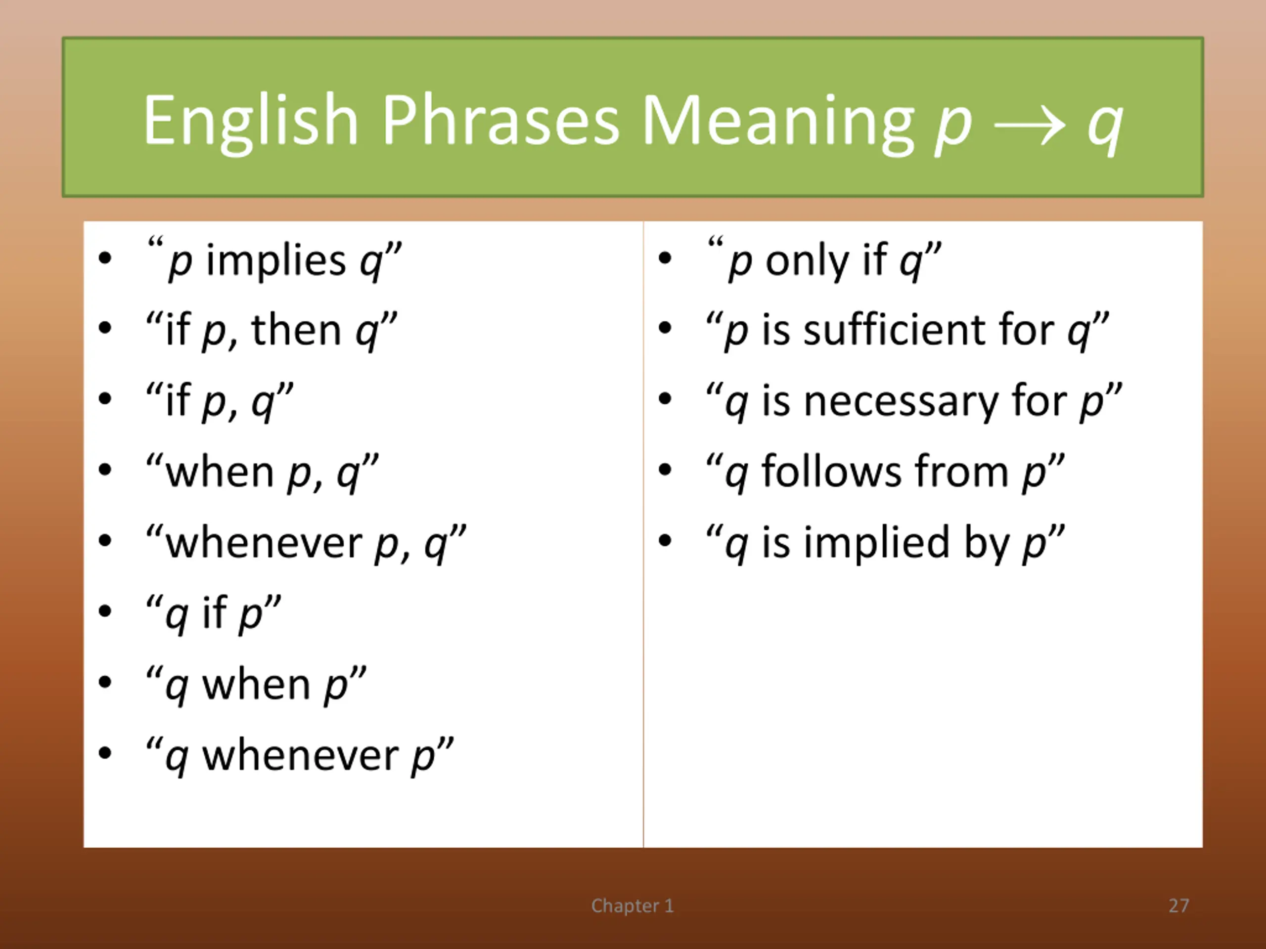 English Phrases Meaning p q p implies q if p, then q if p, q when p, q whenever p, q q if p q when p q whenever p p only if q p is sufficient for q q is necessary for p q follows from p q is implied by p Chapter 1 27