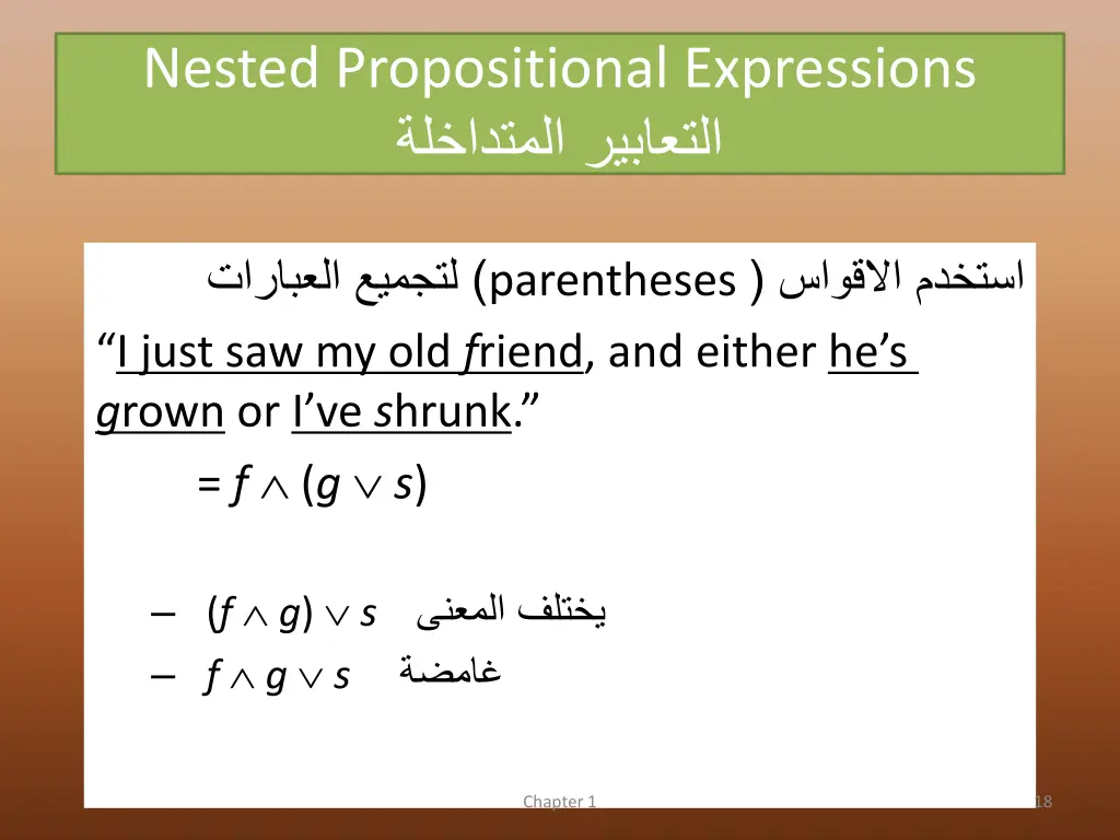 Nested Propositional Expressions I just saw my old friend, and either he s grown or I ve shrunk. = f (g s) ) ( parentheses (f g) s f g s Chapter 1 18