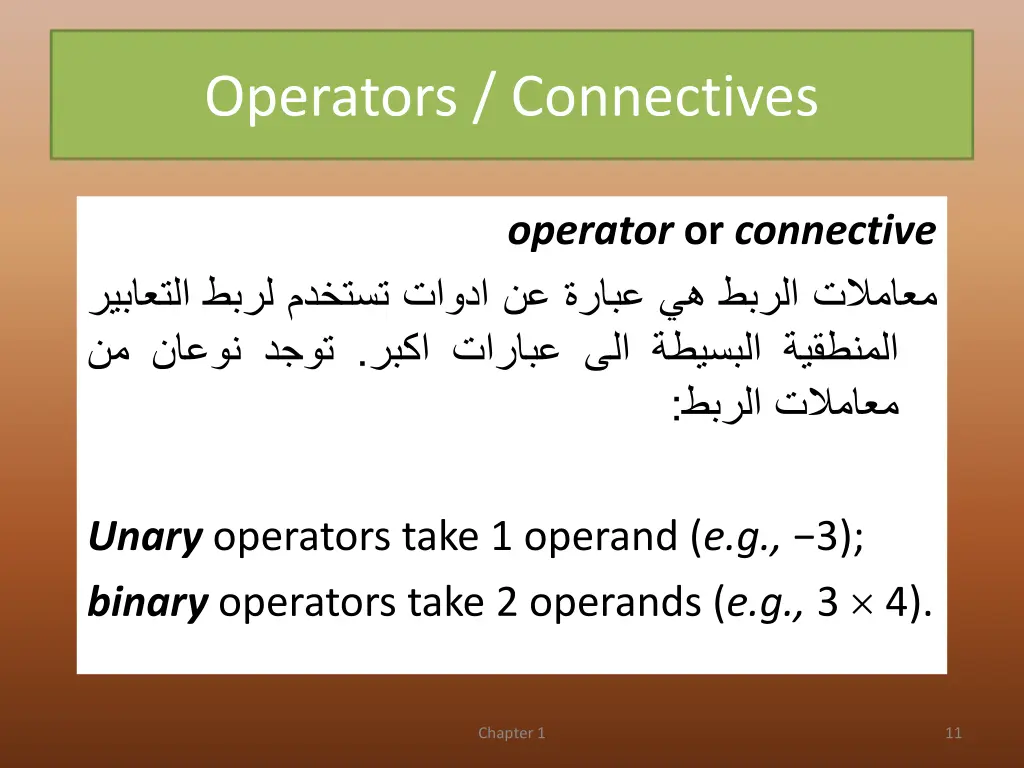 Operators / Connectives operator or connective : . Unary operators take 1 operand (e.g., 3); binaryoperators take 2 operands (e.g., 3 4). Chapter 1 11