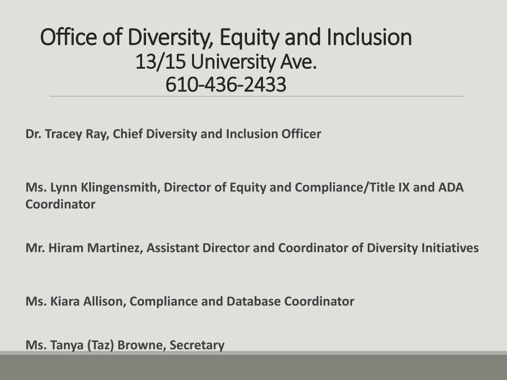 Office of Diversity, Equity and Inclusion Office of Diversity, Equity and Inclusion 13/15 University Ave. 13/15 University Ave. 610 610- -436 436- -2433 2433 Dr. Tracey Ray, Chief Diversity and Inclusion Officer Ms. Lynn Klingensmith, Director of Equity and Compliance/Title IX and ADA Coordinator Mr. Hiram Martinez, Assistant Director and Coordinator of Diversity Initiatives Ms. Kiara Allison, Compliance and Database Coordinator Ms. Tanya (Taz) Browne, Secretary