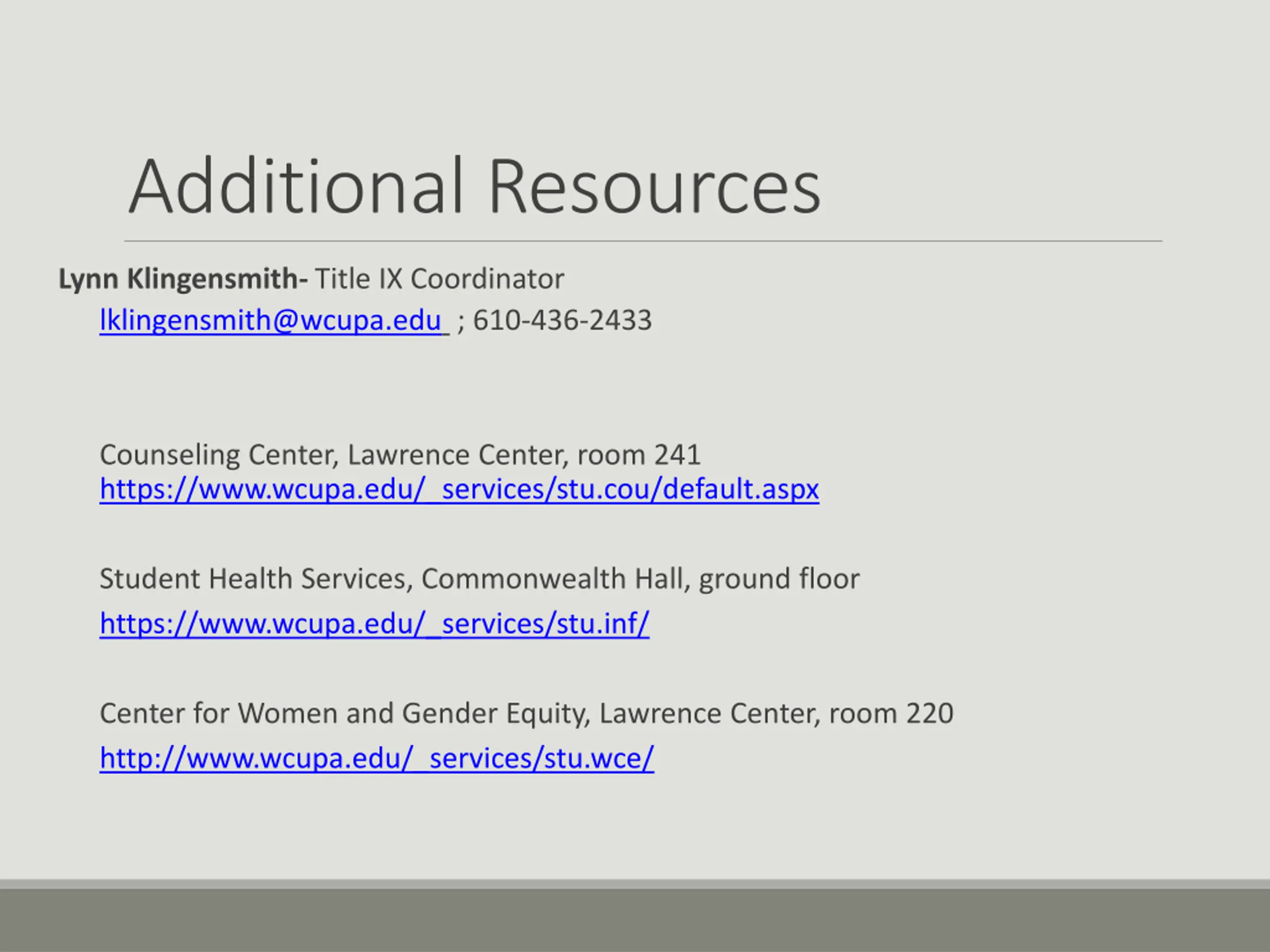 Additional Resources Lynn Klingensmith- Title IX Coordinator lklingensmith@wcupa.edu ; 610-436-2433 Counseling Center, Lawrence Center, room 241 https://www.wcupa.edu/_services/stu.cou/default.aspx Student Health Services, Commonwealth Hall, ground floor https://www.wcupa.edu/_services/stu.inf/ Center for Women and Gender Equity, Lawrence Center, room 220 http://www.wcupa.edu/_services/stu.wce/
