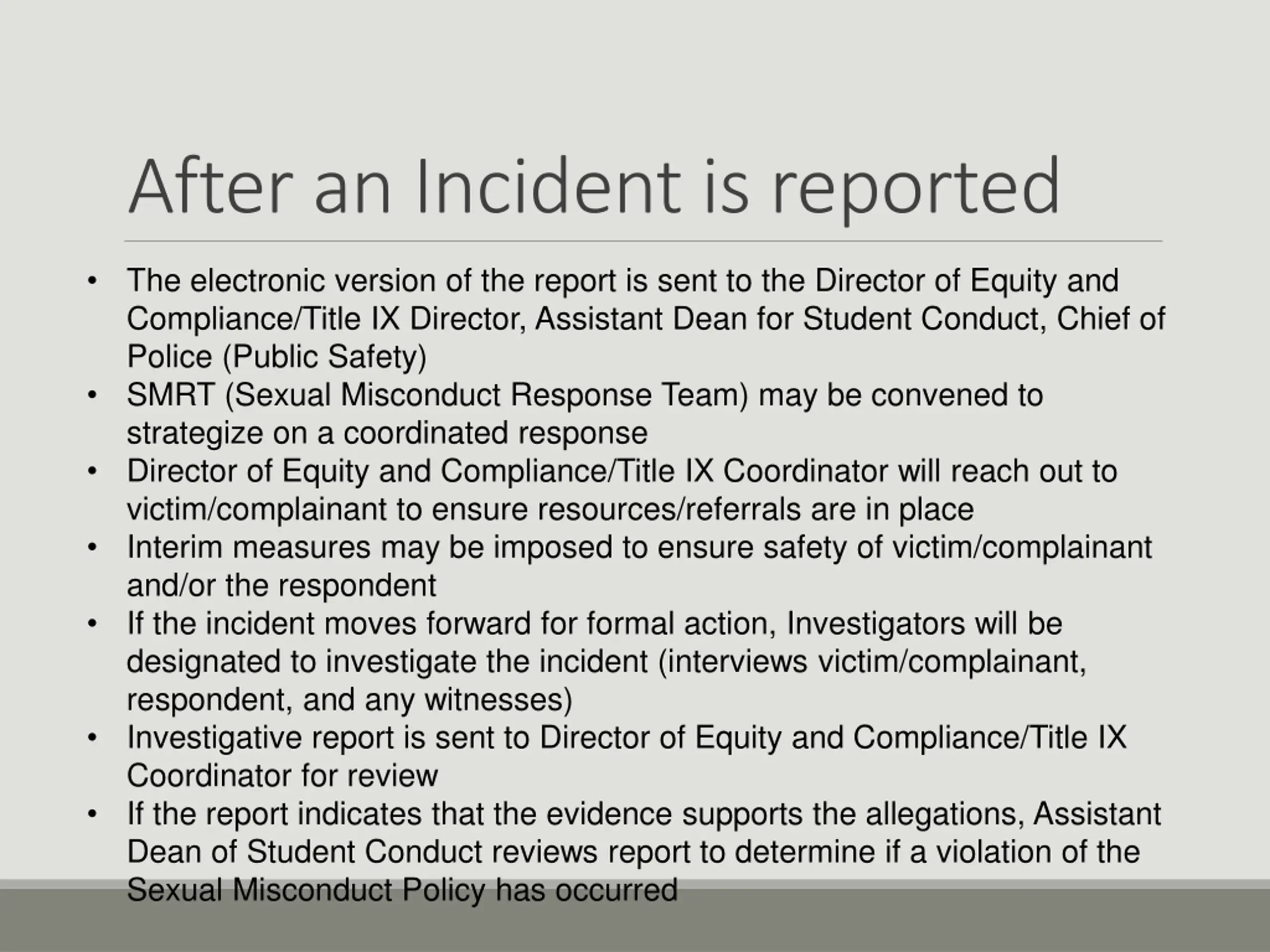 After an Incident is reported The electronic version of the report is sent to the Director of Equity and Compliance/Title IX Director, Assistant Dean for Student Conduct, Chief of Police (Public Safety) SMRT (Sexual Misconduct Response Team) may be convened to strategize on a coordinated response Director of Equity and Compliance/Title IX Coordinator will reach out to victim/complainant to ensure resources/referrals are in place Interim measures may be imposed to ensure safety of victim/complainant and/or the respondent If the incident moves forward for formal action, Investigators will be designated to investigate the incident (interviews victim/complainant, respondent, and any witnesses) Investigative report is sent to Director of Equity and Compliance/Title IX Coordinator for review If the report indicates that the evidence supports the allegations, Assistant Dean of Student Conduct reviews report to determine if a violation of the Sexual Misconduct Policy has occurred