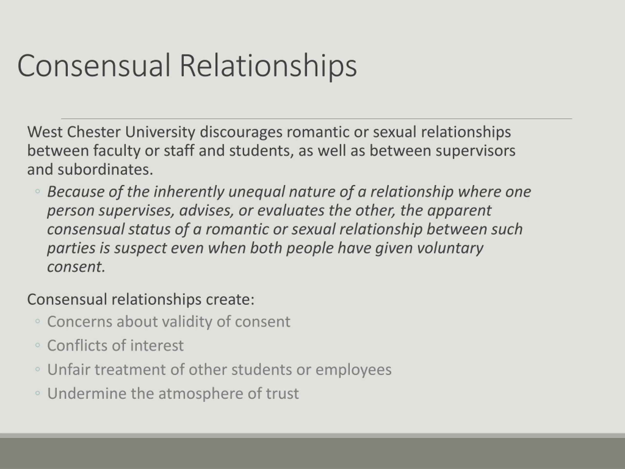 Consensual Relationships West Chester University discourages romantic or sexual relationships between faculty or staff and students, as well as between supervisors and subordinates. Because of the inherently unequal nature of a relationship where one person supervises, advises, or evaluates the other, the apparent consensual status of a romantic or sexual relationship between such parties is suspect even when both people have given voluntary consent. Consensual relationships create: Concerns about validity of consent Conflicts of interest Unfair treatment of other students or employees Undermine the atmosphere of trust