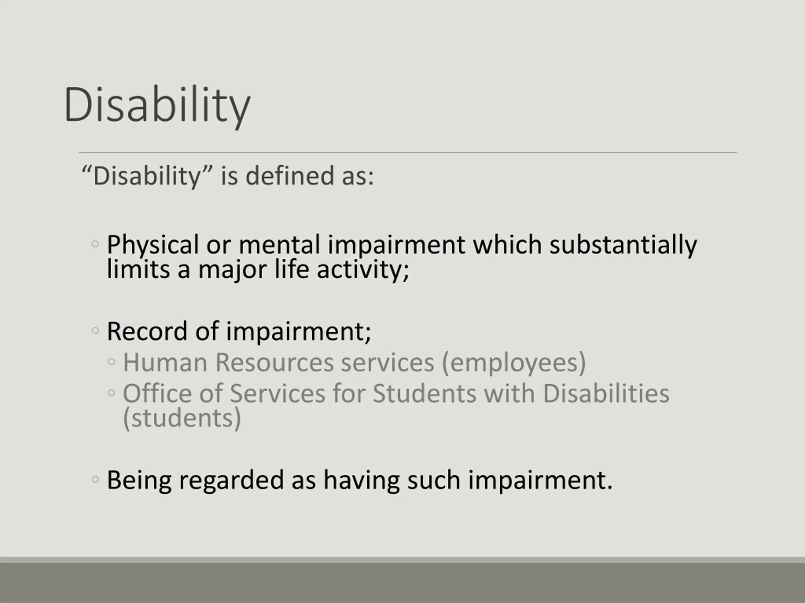 Disability Disability is defined as: Physical or mental impairment which substantially limits a major life activity; Record of impairment; Human Resources services (employees) Office of Services for Students with Disabilities (students) Being regarded as having such impairment.