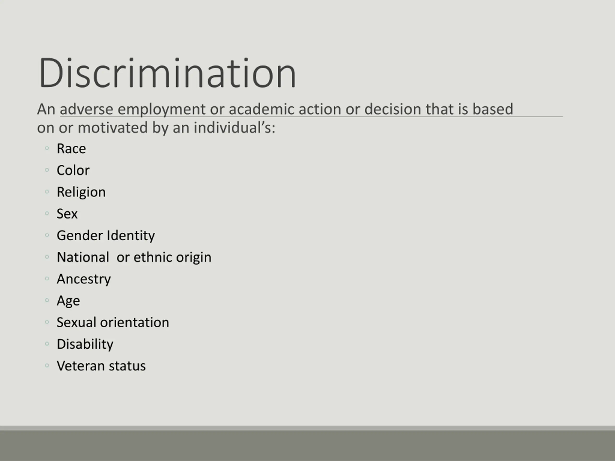 Discrimination An adverse employment or academic action or decision that is based on or motivated by an individual s: Race Color Religion Sex Gender Identity National or ethnic origin Ancestry Age Sexual orientation Disability Veteran status