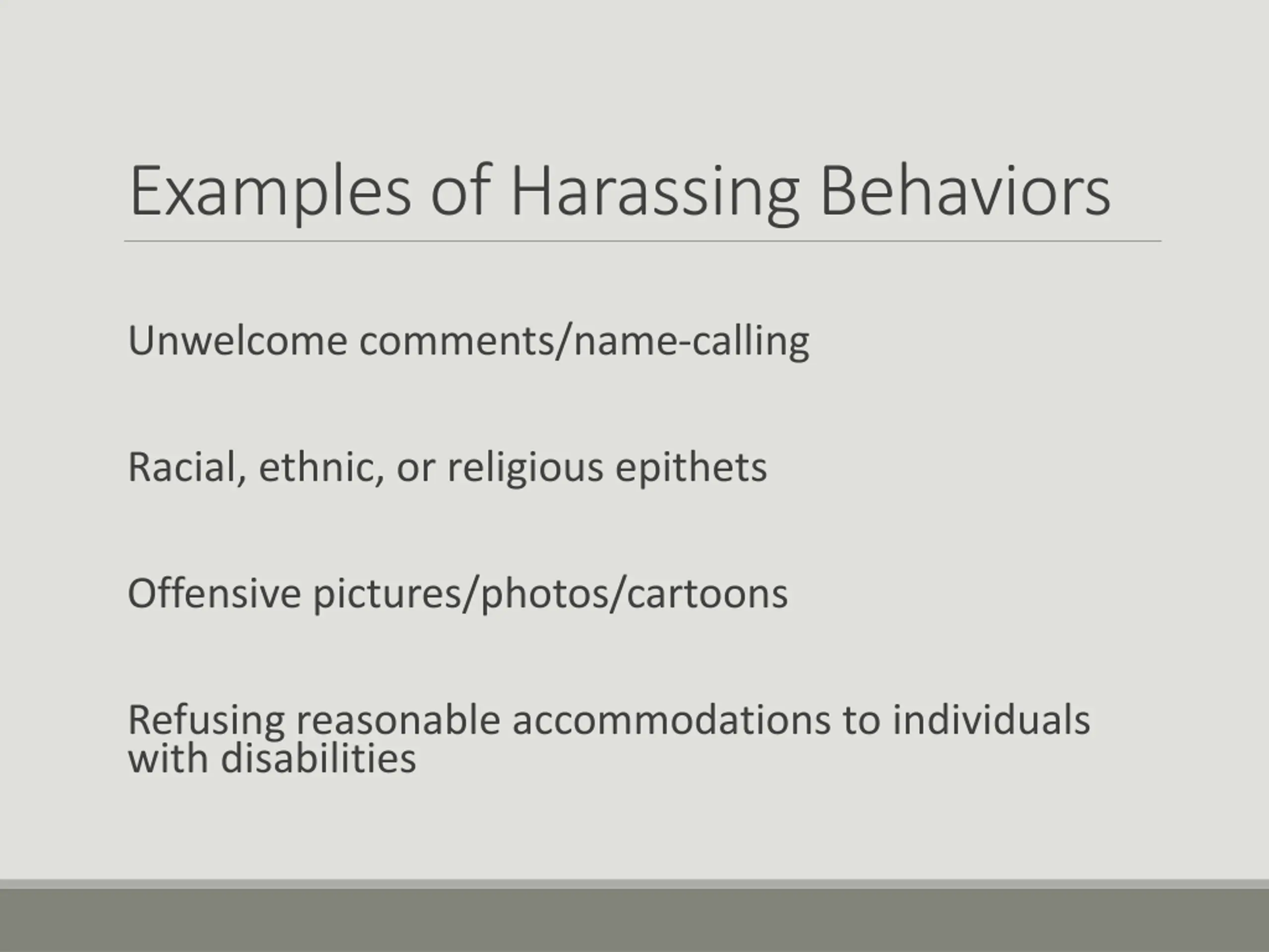 Examples of Harassing Behaviors Unwelcome comments/name-calling Racial, ethnic, or religious epithets Offensive pictures/photos/cartoons Refusing reasonable accommodations to individuals with disabilities